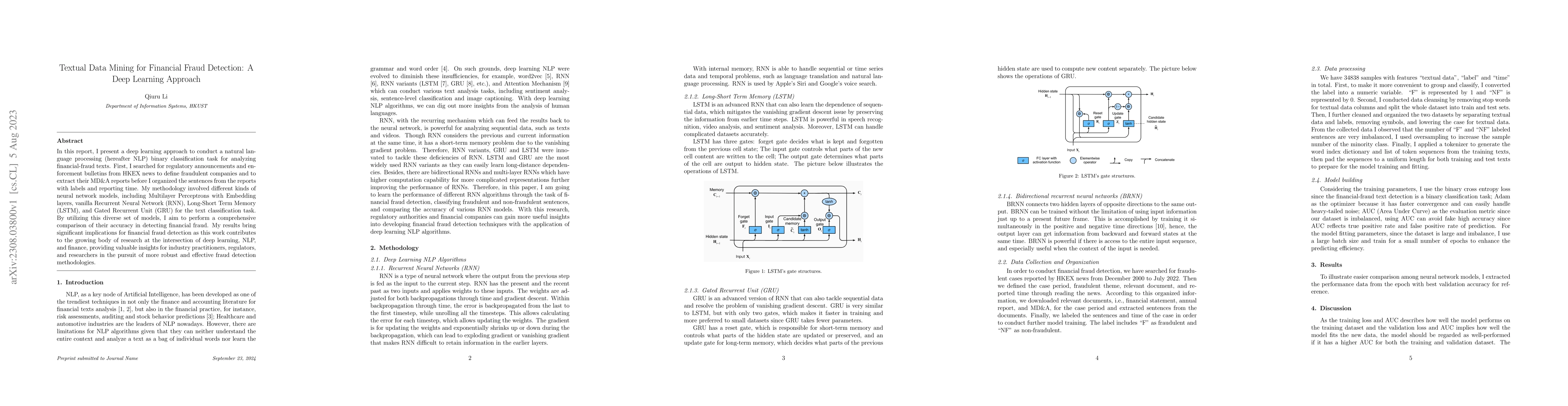 This paper explores a deep learning approach for detecting financial fraud using NLP techniques, employing various neural network models to classify fraudulent texts extracted from regulatory announcements. The study compares the performance of different models, offering insights for improving fraud detection methodologies.