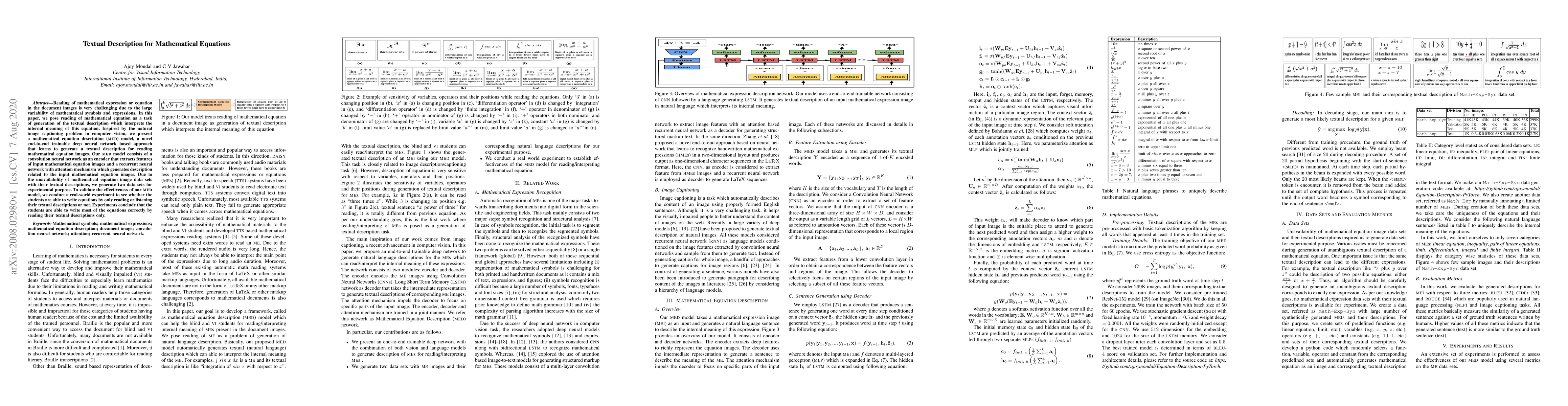 This paper introduces a novel deep neural network model, MED, to generate textual descriptions for mathematical equations in document images. The MED model combines a convolutional neural network encoder with a recurrent neural network and attention mechanism to interpret and describe mathematical equations, demonstrating effectiveness through experiments where students successfully recreated equations from textual descriptions.