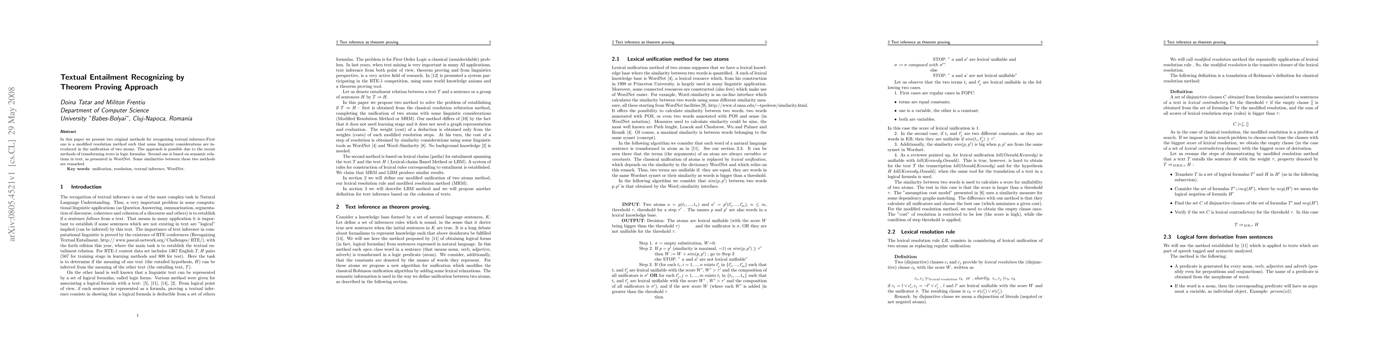 This paper introduces two methods for textual entailment recognition: one modifies resolution with linguistic considerations for logic formula unification, and the other leverages semantic relations from WordNet, noting similarities between the two approaches.