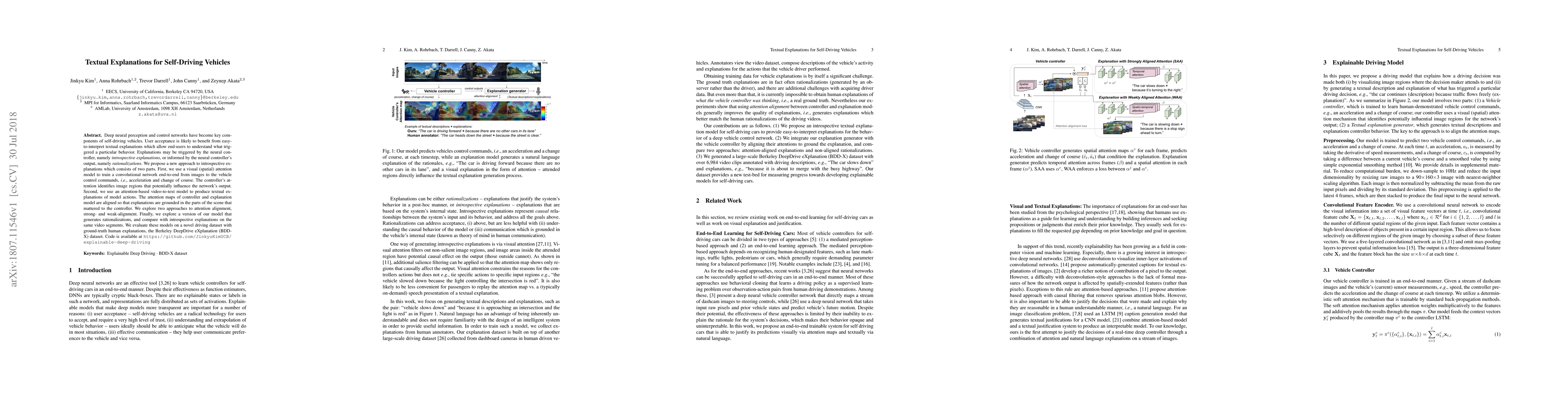 This research proposes a new approach to providing textual explanations for self-driving vehicles, using visual attention models to understand the vehicle's actions and generate easy-to-understand text.