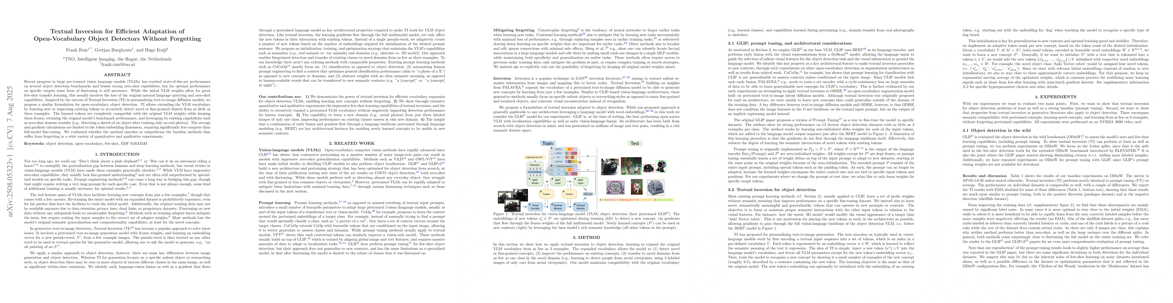 Recent progress in large pre-trained vision language models (VLMs) has reached state-of-the-art performance on several object detection benchmarks and boasts strong zero-shot capabilities, but for optimal performance on specific targets some form of finetuning is still necessary. While the initial VLM weights allow for great few-shot transfer learning, this usually involves the loss of the original natural language querying and zero-shot capabilities. Inspired by the success of Textual Inversion (TI) in personalizing text-to-image diffusion models, we propose a similar formulation for open-vocabulary object detection. TI allows extending the VLM vocabulary by learning new or improving existing tokens to accurately detect novel or fine-grained objects from as little as three examples. The learned tokens are completely compatible with the original VLM weights while keeping them frozen, retaining the original model's benchmark performance, and leveraging its existing capabilities such as zero-shot domain transfer (e.g., detecting a sketch of an object after training only on real photos). The storage and gradient calculations are limited to the token embedding dimension, requiring significantly less compute than full-model fine-tuning. We evaluated whether the method matches or outperforms the baseline methods that suffer from forgetting in a wide variety of quantitative and qualitative experiments.