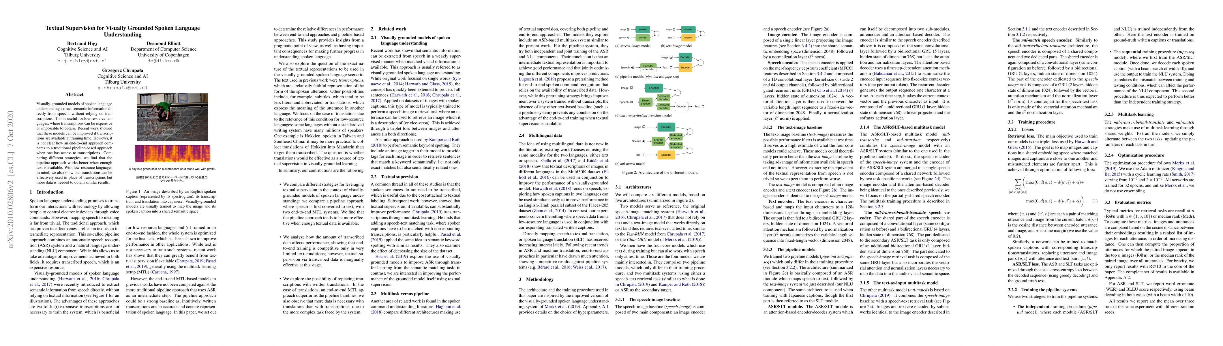 This paper explores visually-grounded spoken language understanding models, comparing end-to-end and pipeline approaches. It finds that pipeline methods perform better with sufficient textual data, while translations can substitute for transcriptions in low-resource languages, though more data is needed for comparable results.