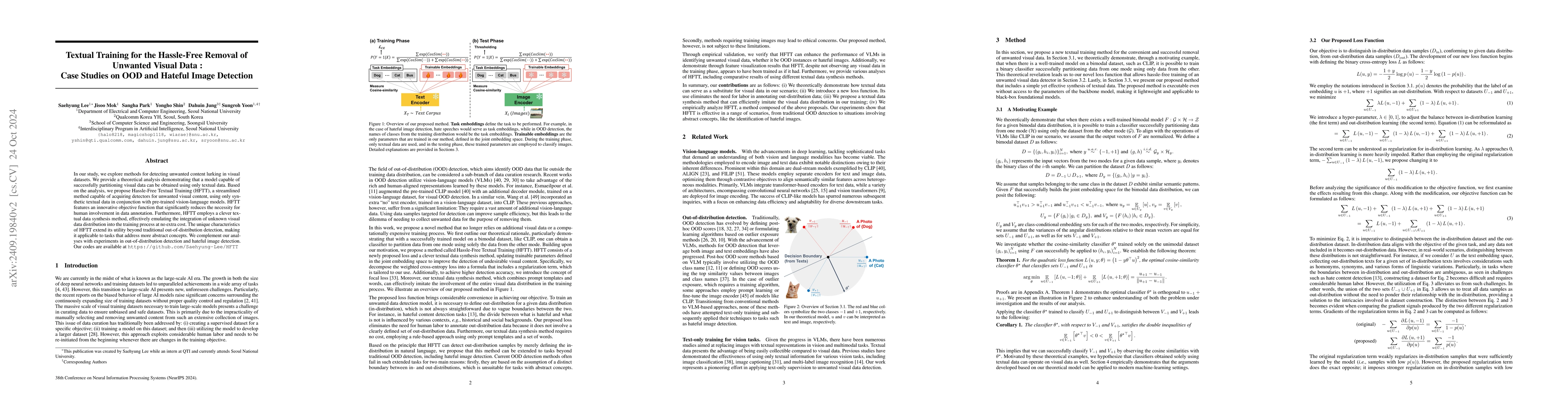 This paper proposes Hassle-Free Textual Training (HFTT), a method that leverages textual data and pre-trained vision-language models to detect unwanted visual content with minimal human annotation. HFTT's innovative objective function and synthetic textual data synthesis enable effective out-of-distribution detection and hateful image detection.