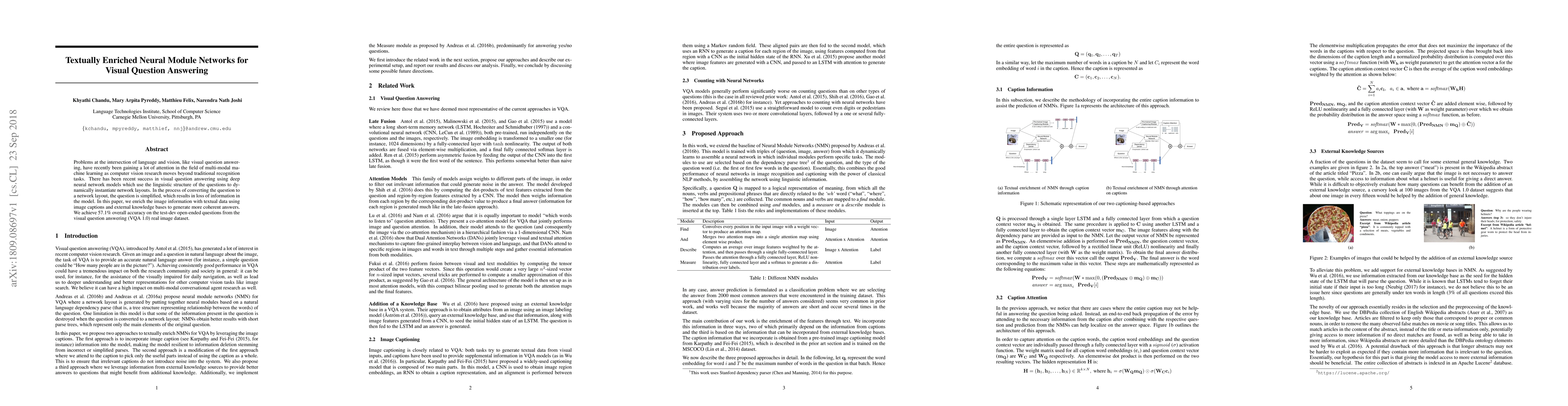 Problems at the intersection of language and vision, like visual question answering, have recently been gaining a lot of attention in the field of multi-modal machine learning as computer vision research moves beyond traditional recognition tasks. There has been recent success in visual question answering using deep neural network models which use the linguistic structure of the questions to dynamically instantiate network layouts. In the process of converting the question to a network layout, the question is simplified, which results in loss of information in the model. In this paper, we enrich the image information with textual data using image captions and external knowledge bases to generate more coherent answers. We achieve 57.1% overall accuracy on the test-dev open-ended questions from the visual question answering (VQA 1.0) real image dataset.