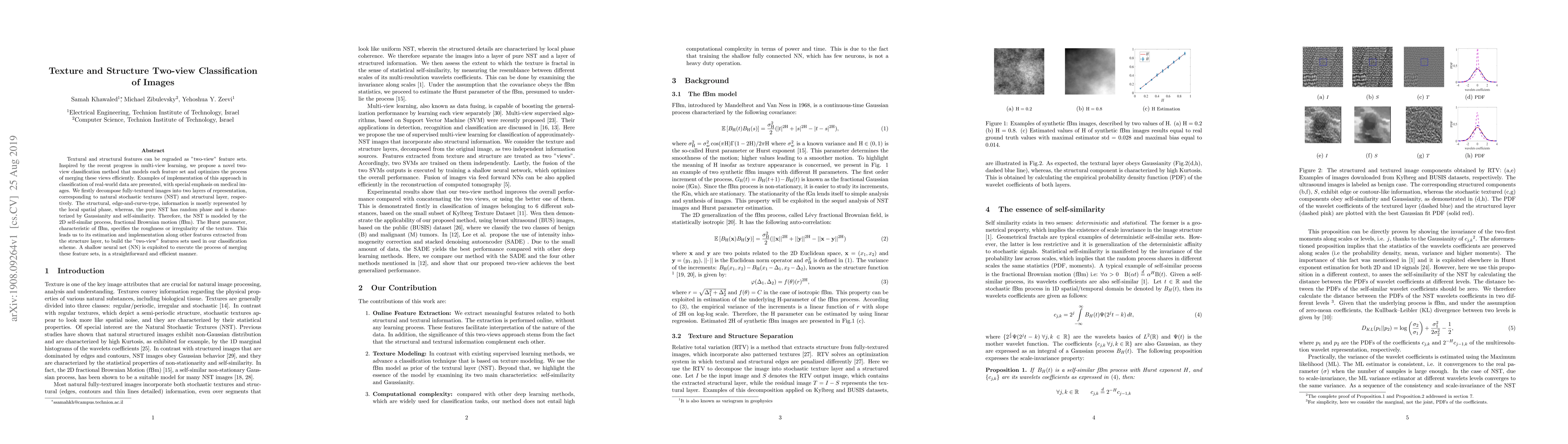 Textural and structural features can be regraded as "two-view" feature sets. Inspired by the recent progress in multi-view learning, we propose a novel two-view classification method that models each feature set and optimizes the process of merging these views efficiently. Examples of implementation of this approach in classification of real-world data are presented, with special emphasis on medical images. We firstly decompose fully-textured images into two layers of representation, corresponding to natural stochastic textures (NST) and structural layer, respectively. The structural, edge-and-curve-type, information is mostly represented by the local spatial phase, whereas, the pure NST has random phase and is characterized by Gaussianity and self-similarity. Therefore, the NST is modeled by the 2D self-similar process, fractional Brownian motion (fBm). The Hurst parameter, characteristic of fBm, specifies the roughness or irregularity of the texture. This leads us to its estimation and implementation along other features extracted from the structure layer, to build the "two-view" features sets used in our classification scheme. A shallow neural net (NN) is exploited to execute the process of merging these feature sets, in a straightforward and efficient manner.
