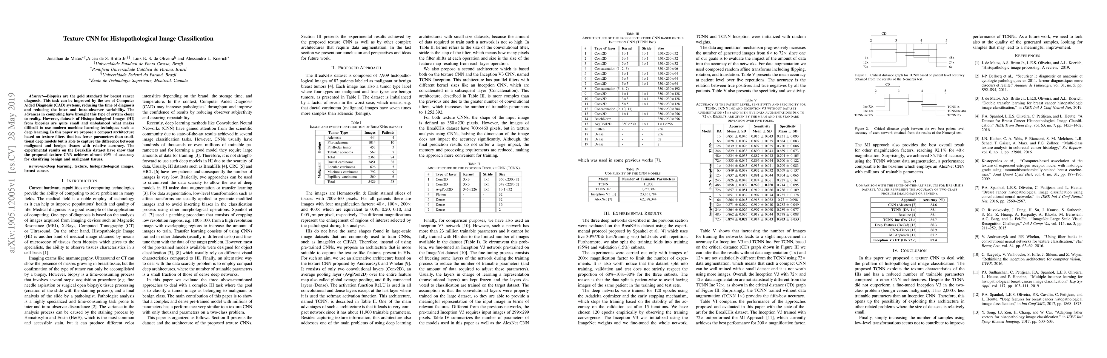 Biopsies are the gold standard for breast cancer diagnosis. This task can be improved by the use of Computer Aided Diagnosis (CAD) systems, reducing the time of diagnosis and reducing the inter and intra-observer variability. The advances in computing have brought this type of system closer to reality. However, datasets of Histopathological Images (HI) from biopsies are quite small and unbalanced what makes difficult to use modern machine learning techniques such as deep learning. In this paper we propose a compact architecture based on texture filters that has fewer parameters than traditional deep models but is able to capture the difference between malignant and benign tissues with relative accuracy. The experimental results on the BreakHis dataset have show that the proposed texture CNN achieves almost 90% of accuracy for classifying benign and malignant tissues.