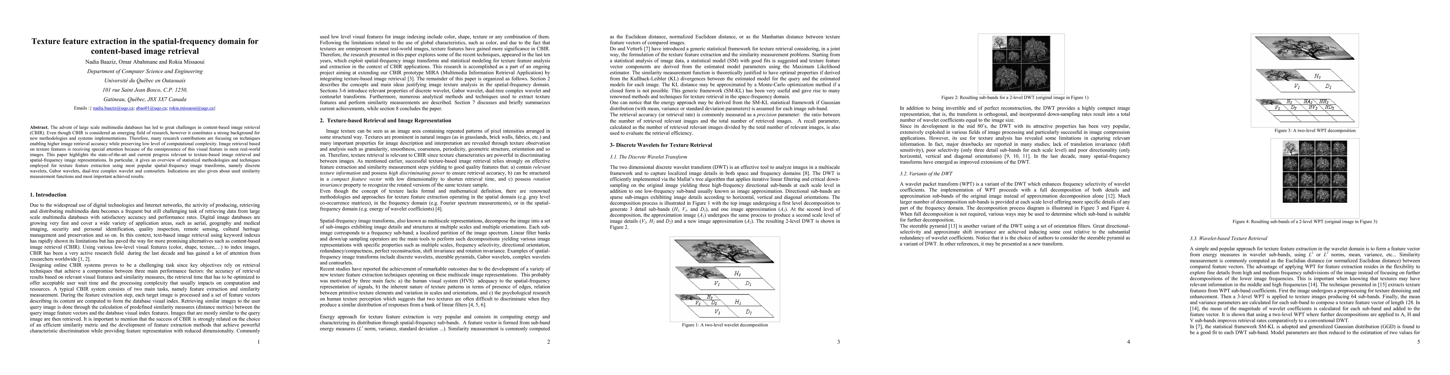 This paper reviews advanced techniques for extracting texture features in the spatial-frequency domain to enhance content-based image retrieval (CBIR) accuracy, focusing on methodologies using discrete wavelets, Gabor wavelets, dual-tree complex wavelets, and contourlets. It also discusses similarity measurement functions and notable results achieved.
