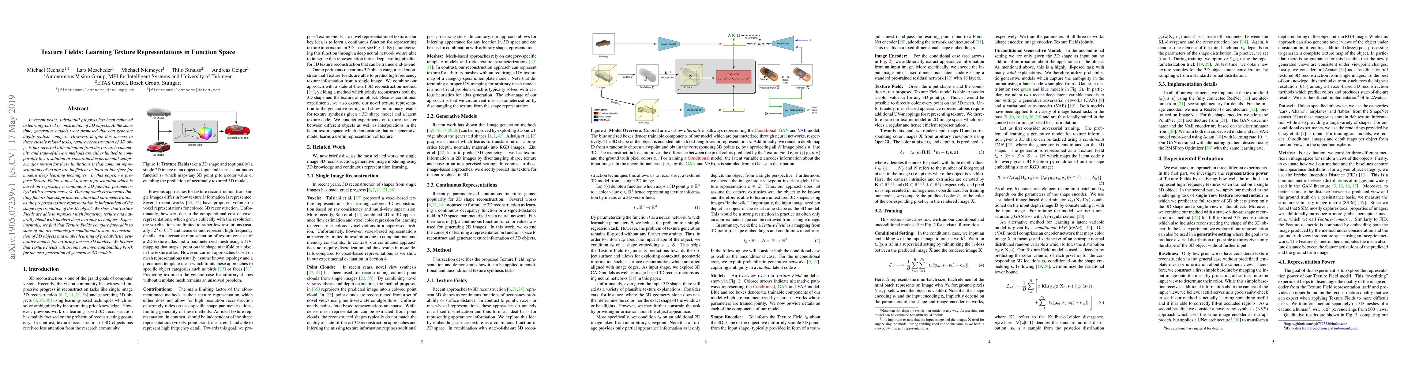 In recent years, substantial progress has been achieved in learning-based reconstruction of 3D objects. At the same time, generative models were proposed that can generate highly realistic images. However, despite this success in these closely related tasks, texture reconstruction of 3D objects has received little attention from the research community and state-of-the-art methods are either limited to comparably low resolution or constrained experimental setups. A major reason for these limitations is that common representations of texture are inefficient or hard to interface for modern deep learning techniques. In this paper, we propose Texture Fields, a novel texture representation which is based on regressing a continuous 3D function parameterized with a neural network. Our approach circumvents limiting factors like shape discretization and parameterization, as the proposed texture representation is independent of the shape representation of the 3D object. We show that Texture Fields are able to represent high frequency texture and naturally blend with modern deep learning techniques. Experimentally, we find that Texture Fields compare favorably to state-of-the-art methods for conditional texture reconstruction of 3D objects and enable learning of probabilistic generative models for texturing unseen 3D models. We believe that Texture Fields will become an important building block for the next generation of generative 3D models.