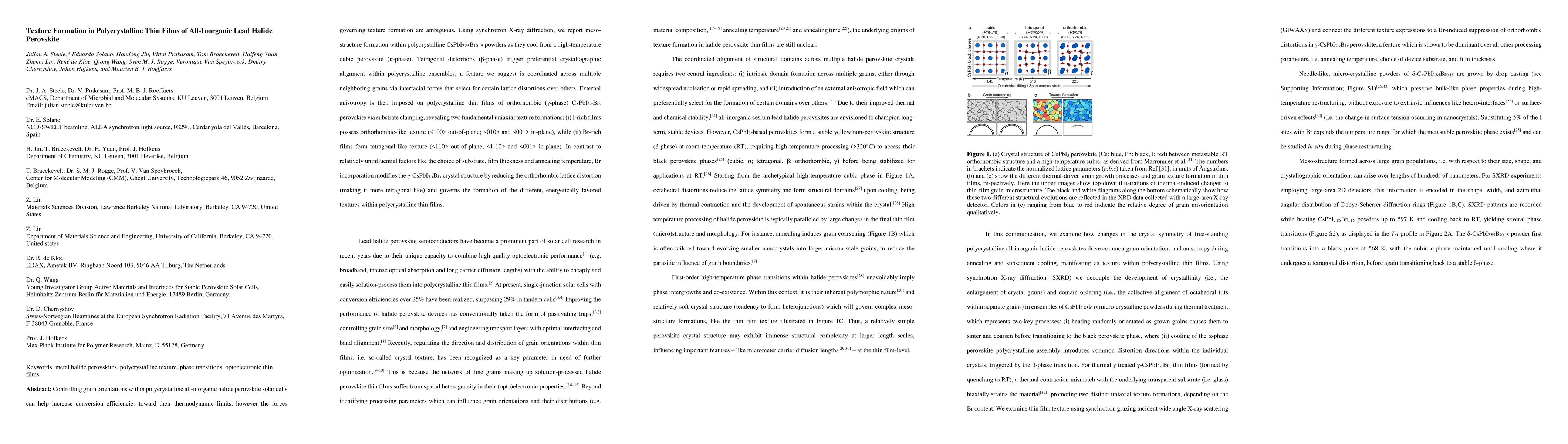 The study elucidates how tetragonal distortions and Br incorporation in polycrystalline all-inorganic lead halide perovskite thin films affect texture formation, demonstrating that Br-rich films develop tetragonal-like textures due to reduced orthorhombic lattice distortions, while I-rich films show orthorhombic-like textures. External anisotropy through substrate clamping further influences these textures.