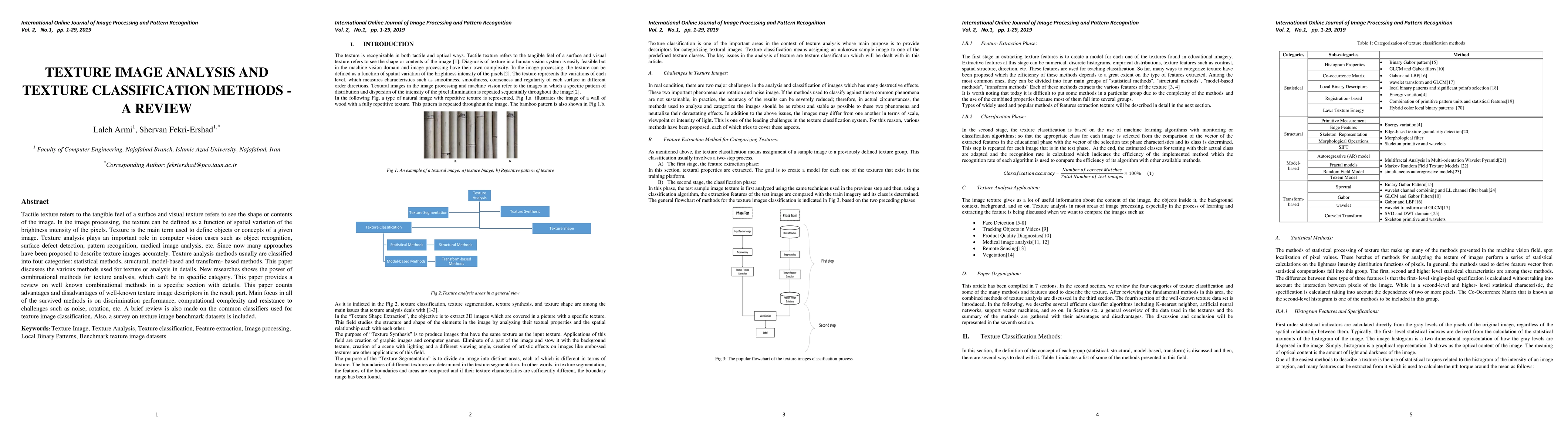 This paper reviews various texture image analysis methods, categorizing them into statistical, structural, model-based, and transform-based approaches. It highlights the advantages and disadvantages of these methods, focusing on discrimination performance, computational complexity, and robustness to noise and rotation, and includes a survey on common classifiers and benchmark datasets.