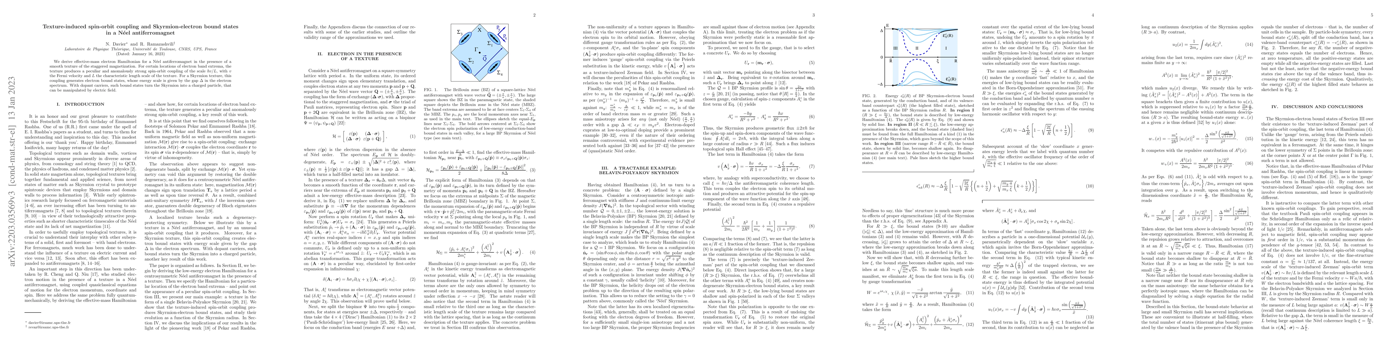This paper derives an effective-mass electron Hamiltonian for a N\'eel antiferromagnet with a smooth staggered magnetization texture, revealing strong spin-orbit coupling that generates Skyrmion-electron bound states. These bound states can turn Skyrmions into charge carriers manipulable by electric fields.