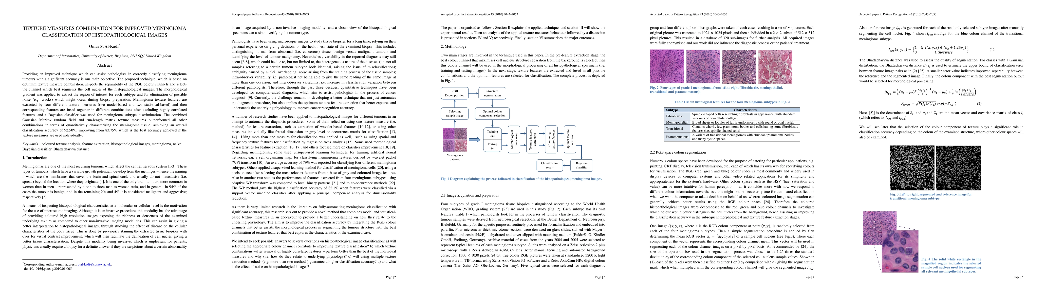 Providing an improved technique which can assist pathologists in correctly classifying meningioma tumours with a significant accuracy is our main objective. The proposed technique, which is based on optimum texture measure combination, inspects the separability of the RGB colour channels and selects the channel which best segments the cell nuclei of the histopathological images. The morphological gradient was applied to extract the region of interest for each subtype and for elimination of possible noise (e.g. cracks) which might occur during biopsy preparation. Meningioma texture features are extracted by four different texture measures (two model-based and two statistical-based) and then corresponding features are fused together in different combinations after excluding highly correlated features, and a Bayesian classifier was used for meningioma subtype discrimination. The combined Gaussian Markov random field and run-length matrix texture measures outperformed all other combinations in terms of quantitatively characterising the meningioma tissue, achieving an overall classification accuracy of 92.50%, improving from 83.75% which is the best accuracy achieved if the texture measures are used individually.