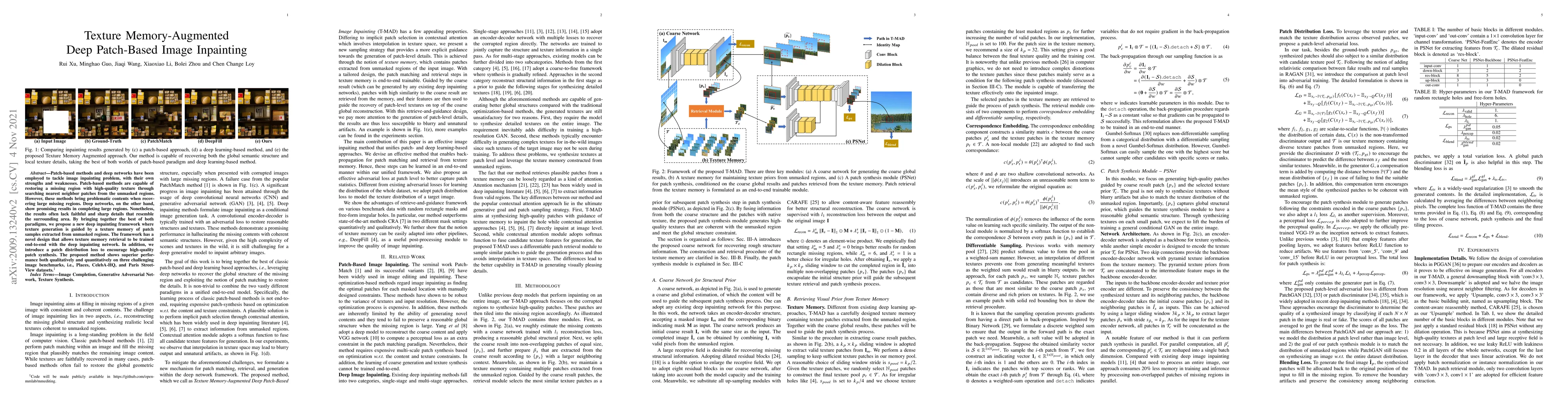 This paper proposes a novel deep inpainting framework that combines patch-based methods with deep networks, utilizing texture memory to enhance texture generation. The framework trains texture memory retrieval and the inpainting network end-to-end, achieving high-quality and sharp details in large missing regions, as demonstrated on Places, CelebA-HQ, and Paris Street-View datasets.