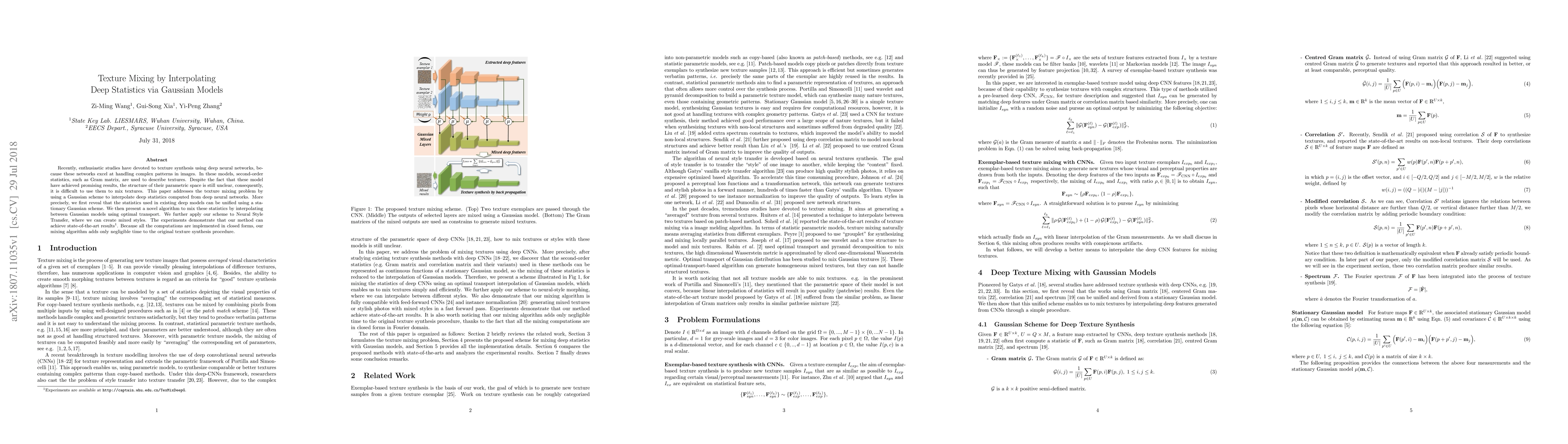 Recently, enthusiastic studies have devoted to texture synthesis using deep neural networks, because these networks excel at handling complex patterns in images. In these models, second-order statistics, such as Gram matrix, are used to describe textures. Despite the fact that these model have achieved promising results, the structure of their parametric space is still unclear, consequently, it is difficult to use them to mix textures. This paper addresses the texture mixing problem by using a Gaussian scheme to interpolate deep statistics computed from deep neural networks. More precisely, we first reveal that the statistics used in existing deep models can be unified using a stationary Gaussian scheme. We then present a novel algorithm to mix these statistics by interpolating between Gaussian models using optimal transport. We further apply our scheme to Neural Style Transfer, where we can create mixed styles. The experiments demonstrate that our method can achieve state-of-the-art results. Because all the computations are implemented in closed forms, our mixing algorithm adds only negligible time to the original texture synthesis procedure.