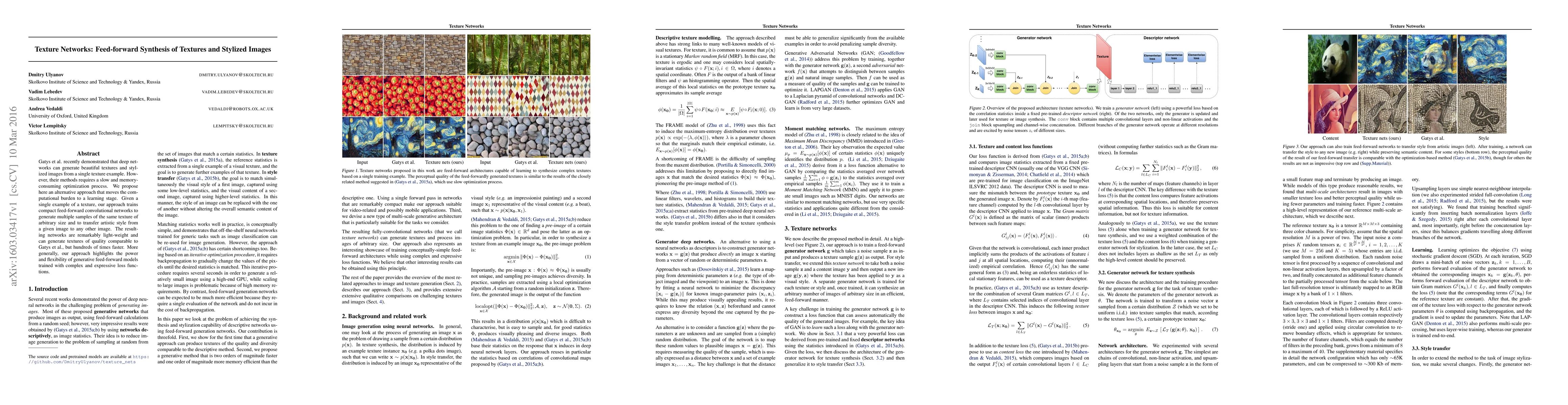 This paper proposes a feed-forward convolutional network trained to generate textures and transfer artistic styles quickly, contrasting with the slow optimization of previous methods. The trained networks can produce high-quality textures and stylized images much faster than traditional approaches.