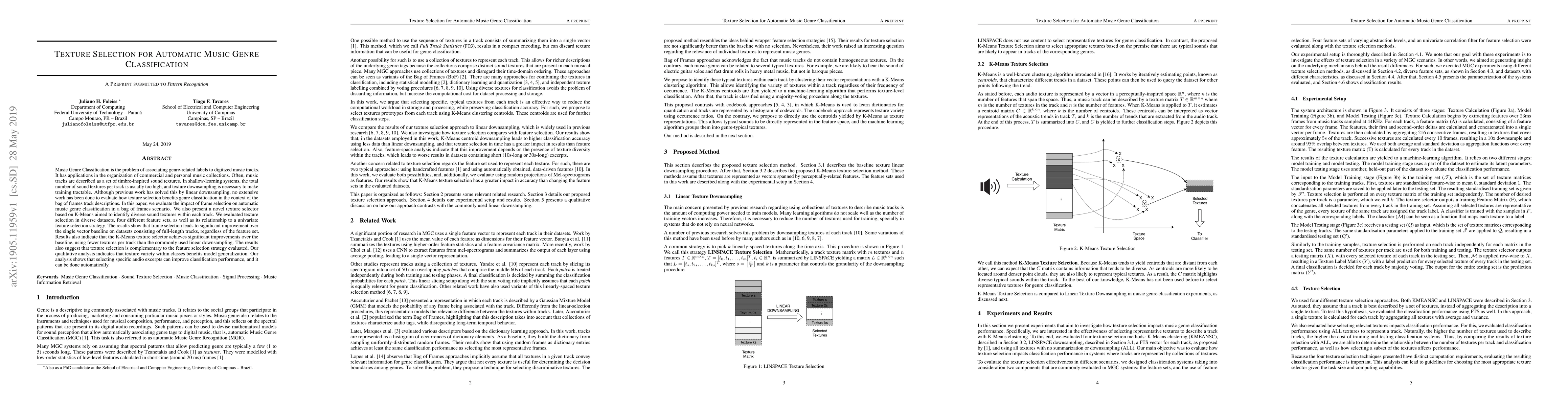 The novelty of this work lies in its focus on texture selection for music genre classification, proposing a K-Means-based method that outperforms linear downsampling while being complementary to feature selection strategies.