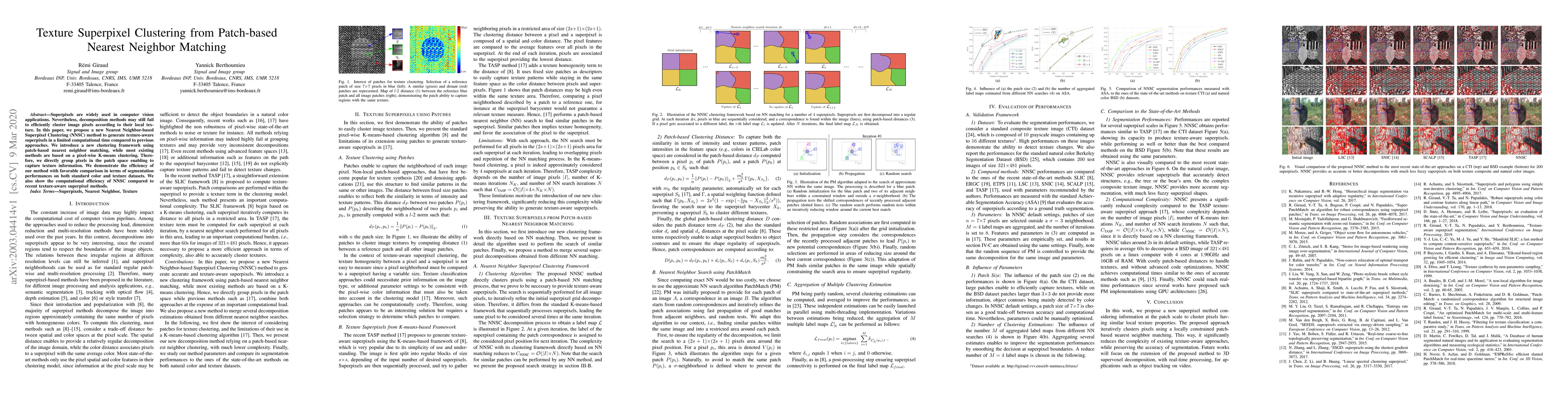 This paper proposes a Nearest Neighbor-based Superpixel Clustering (NNSC) method for generating texture-aware superpixels efficiently. Unlike pixel-wise K-means clustering, NNSC uses patch-based nearest neighbor matching to capture texture information, demonstrating improved segmentation performance and computational efficiency on standard datasets.