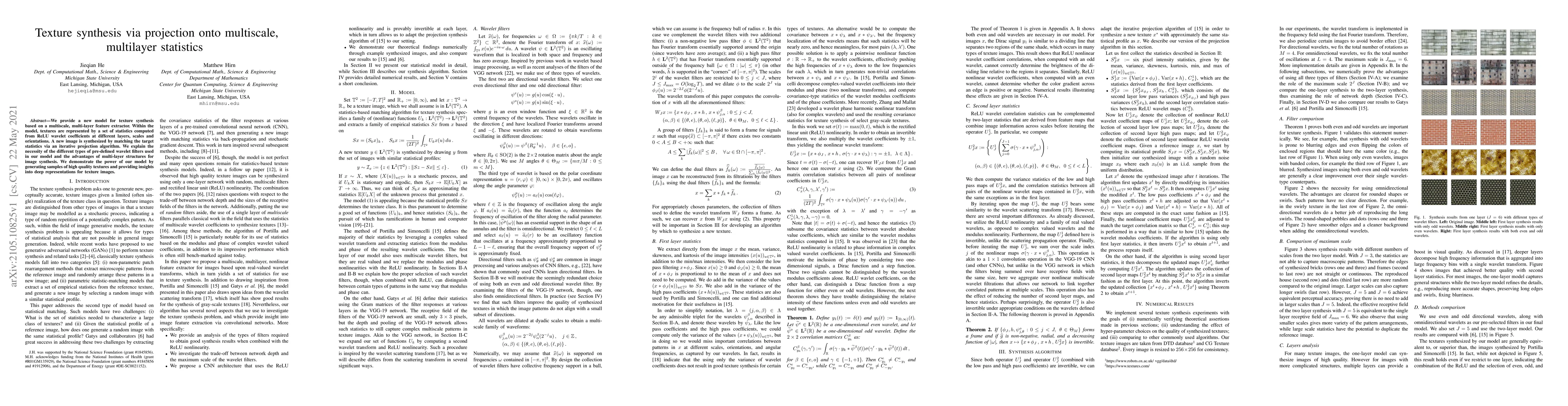 The paper proposes a texture synthesis model using a multiscale, multilayer feature extractor that represents textures via statistics from ReLU wavelet coefficients at different layers, scales, and orientations, and synthesizes new images by matching target statistics via an iterative projection algorithm.