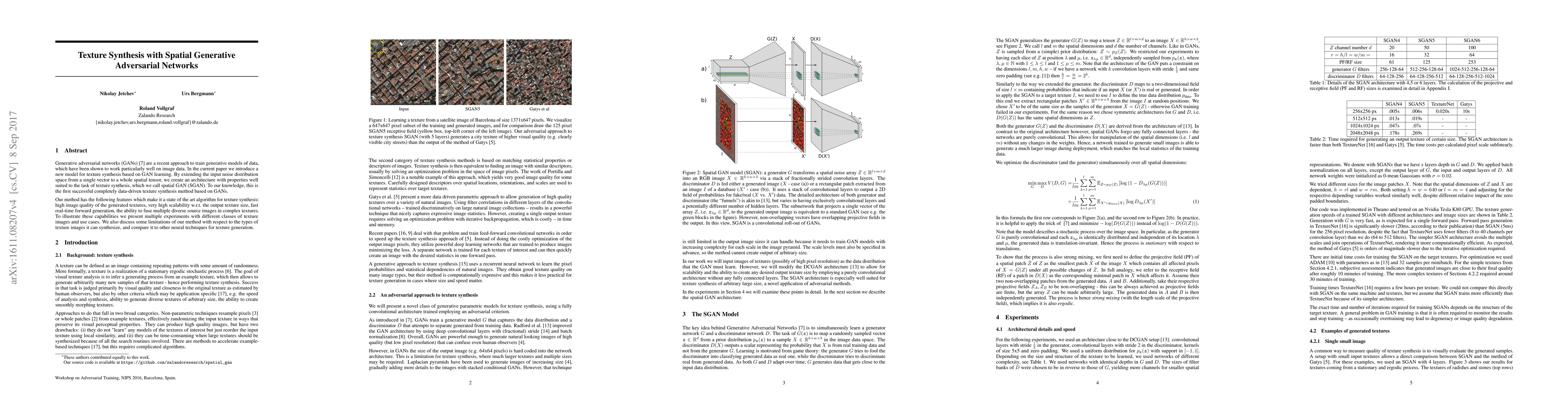 This paper introduces a new spatial GAN (SGAN) for texture synthesis, extending the input noise distribution to a spatial tensor, achieving high-quality, scalable, and real-time texture generation while fusing diverse sources. The method demonstrates state-of-the-art performance but has limitations in synthesizing certain texture types.