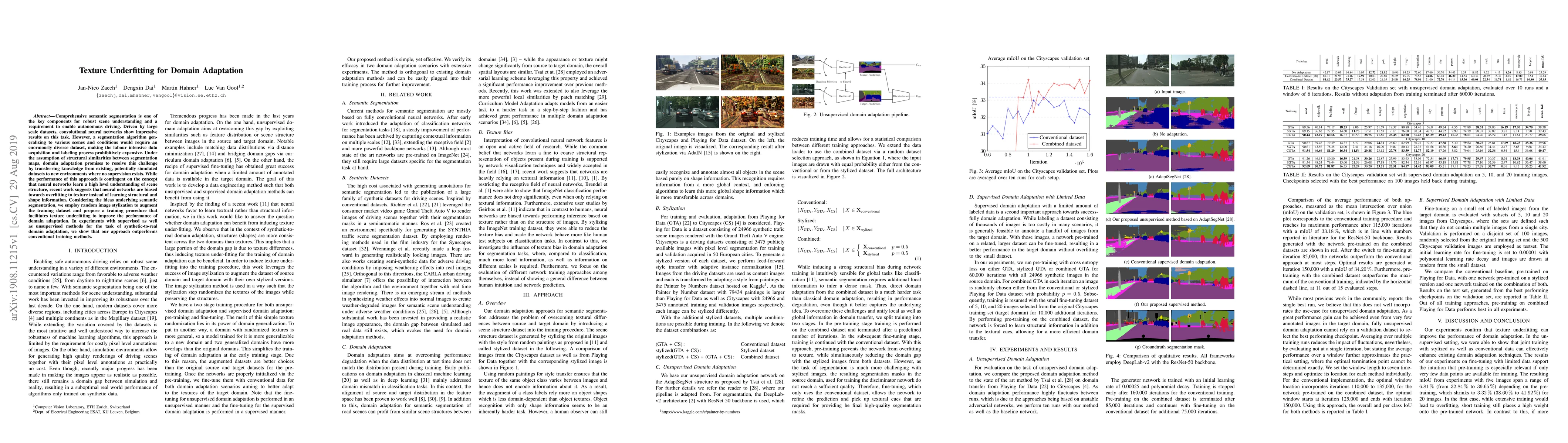 Comprehensive semantic segmentation is one of the key components for robust scene understanding and a requirement to enable autonomous driving. Driven by large scale datasets, convolutional neural networks show impressive results on this task. However, a segmentation algorithm generalizing to various scenes and conditions would require an enormously diverse dataset, making the labour intensive data acquisition and labeling process prohibitively expensive. Under the assumption of structural similarities between segmentation maps, domain adaptation promises to resolve this challenge by transferring knowledge from existing, potentially simulated datasets to new environments where no supervision exists. While the performance of this approach is contingent on the concept that neural networks learn a high level understanding of scene structure, recent work suggests that neural networks are biased towards overfitting to texture instead of learning structural and shape information. Considering the ideas underlying semantic segmentation, we employ random image stylization to augment the training dataset and propose a training procedure that facilitates texture underfitting to improve the performance of domain adaptation. In experiments with supervised as well as unsupervised methods for the task of synthetic-to-real domain adaptation, we show that our approach outperforms conventional training methods.