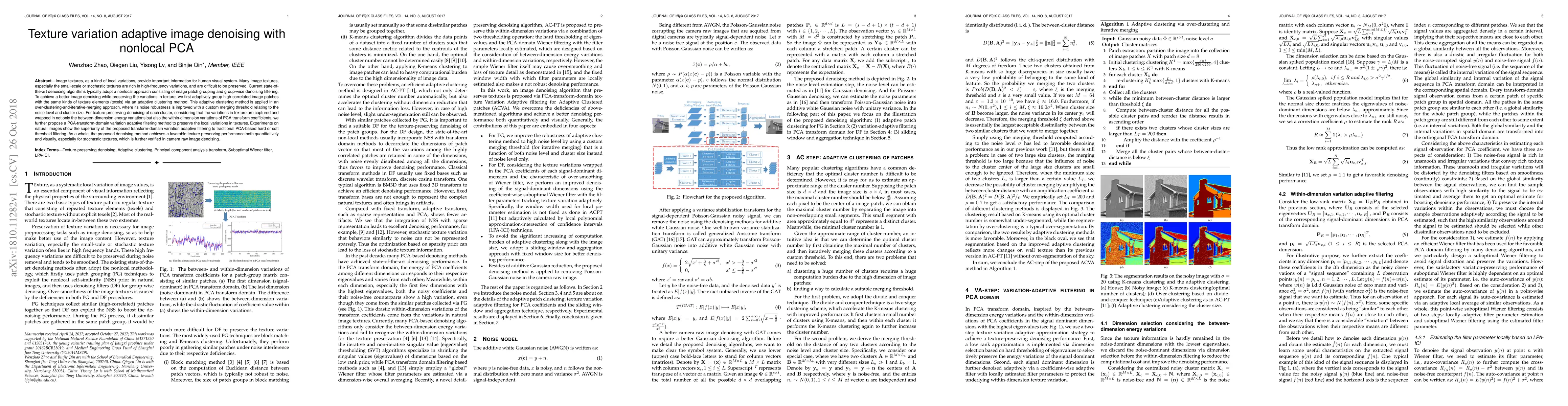 This paper proposes an adaptive image denoising method that groups high correlated image patches based on texture elements, employing an over-clustering-and-iterative-merging approach to enhance noise robustness. It utilizes PCA-transform-domain variation adaptive filtering to preserve local texture variations, achieving superior texture-preserving performance compared to traditional PCA-based filtering methods.