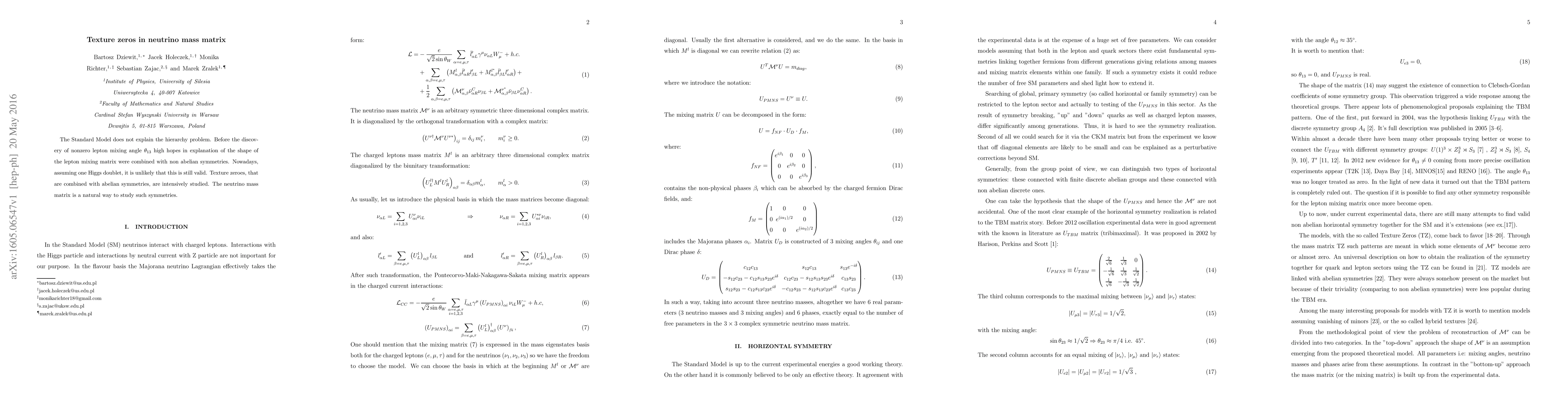 The Standard Model does not explain the hierarchy problem. Before the discovery of nonzero lepton mixing angle {\theta}13 high hopes in explanation of the shape of the lepton mixing matrix were combined with non abelian symmetries. Nowadays, assuming one Higgs doublet, it is unlikely that this is still valid. Texture zeroes, that are combined with abelian symmetries, are intensively studied. The neutrino mass matrix is a natural way to study such symmetries.
