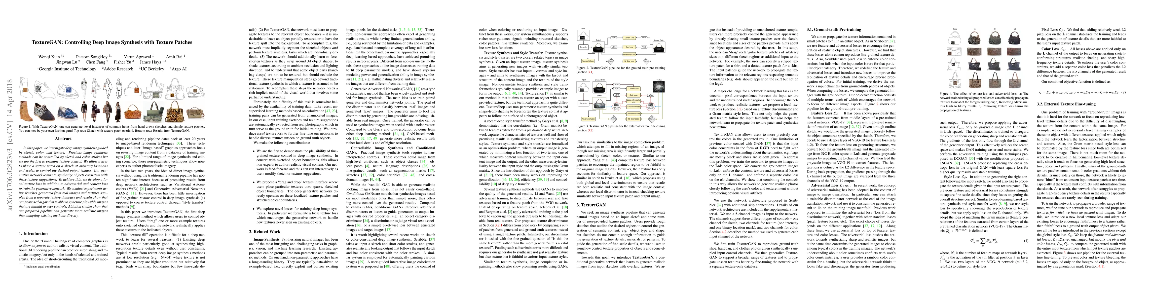 TextureGAN introduces a novel method for deep image synthesis controlled by texture patches, allowing users to place and scale textures on sketches to influence the output. The network employs a local texture loss alongside adversarial and content losses to generate realistic images, outperforming existing methods in ablation studies.