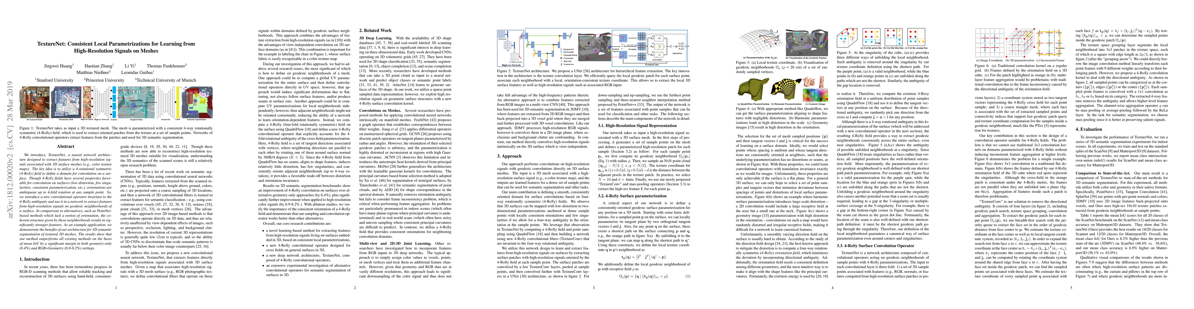 A new neural network architecture, TextureNet, is introduced to extract features from high-resolution signals on 3D surface meshes with improved performance in semantic segmentation of textured 3D meshes.