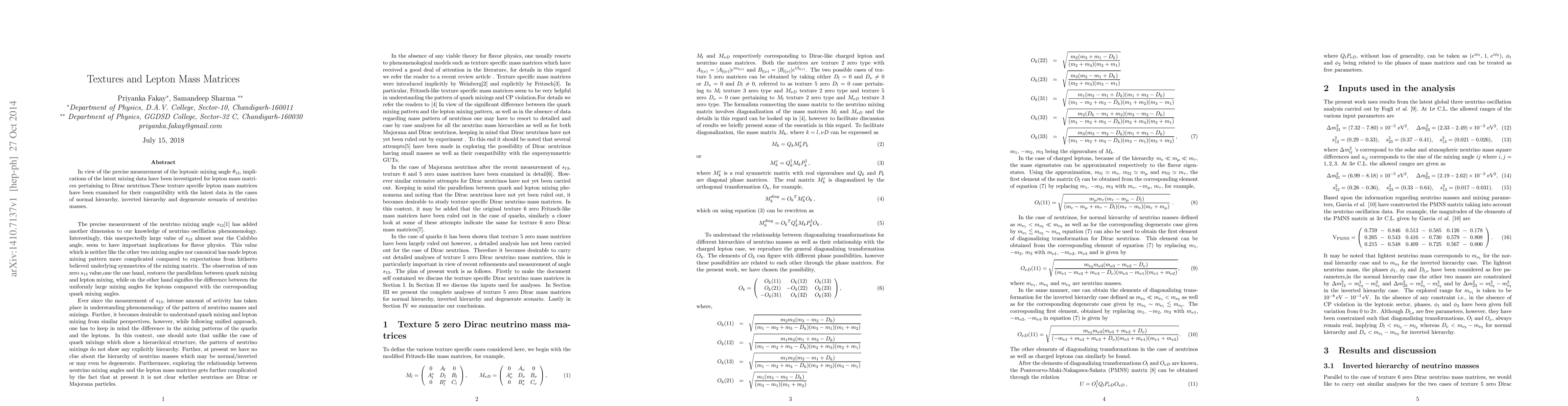 This paper investigates the implications of the latest leptonic mixing angle data on texture-specific lepton mass matrices for Dirac neutrinos, assessing their compatibility under normal, inverted, and degenerate neutrino mass hierarchies.
