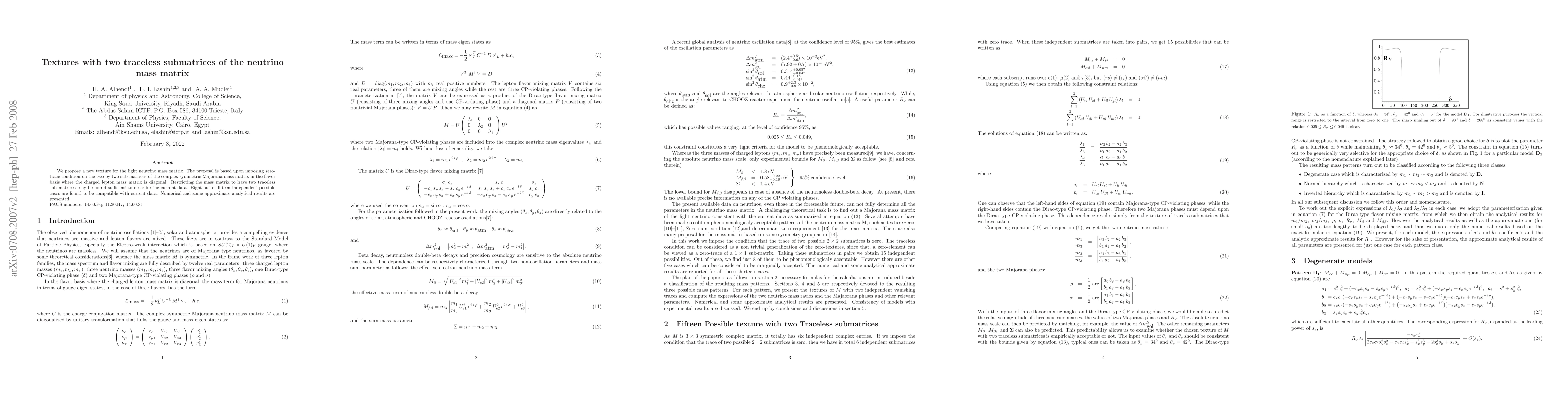 We propose a new texture for the light neutrino mass matrix. The proposal is based upon imposing zero-trace condition on the two by two sub-matrices of the complex symmetric Majorana mass matrix in the flavor basis where the charged lepton mass matrix is diagonal. Restricting the mass matrix to have two traceless sub-matrices may be found sufficient to describe the current data. Eight out of fifteen independent possible cases are found to be compatible with current data. Numerical and some approximate analytical results are presented.