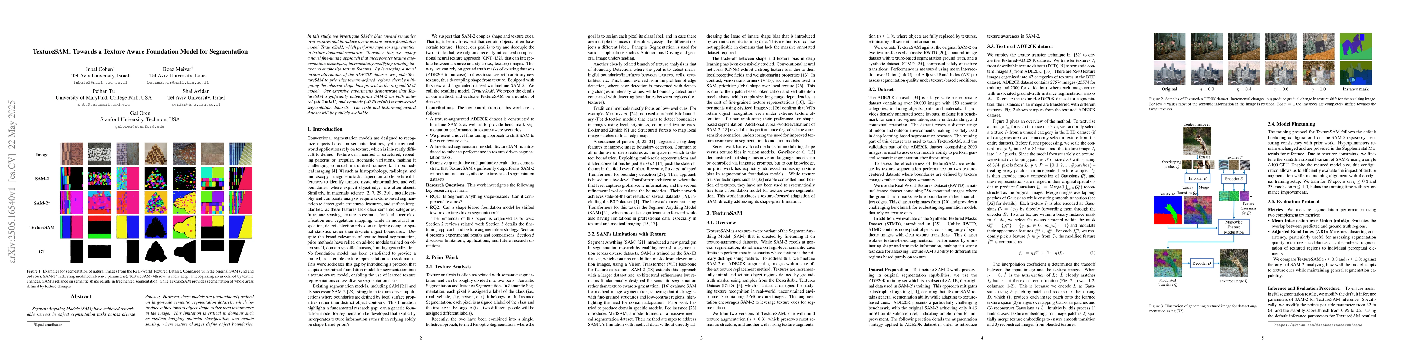 This research is important as it addresses the bias of existing segmentation models (like SAM) toward object shapes over textures, which is critical in domains where texture changes define object boundaries. TextureSAM's improved performance in texture-dominant scenarios can have significant impacts on medical imaging, material classification, and remote sensing applications.