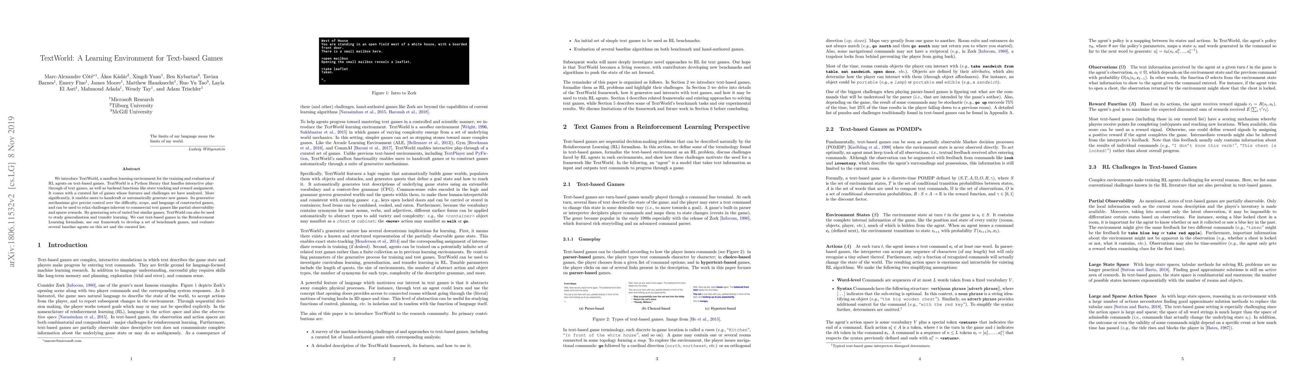 TextWorld is a Python library for training and evaluating RL agents through interactive text-based games, offering tools for state tracking and reward assignment. It supports both handcrafted and automatically generated games, facilitating studies on generalization and transfer learning in reinforcement learning.
