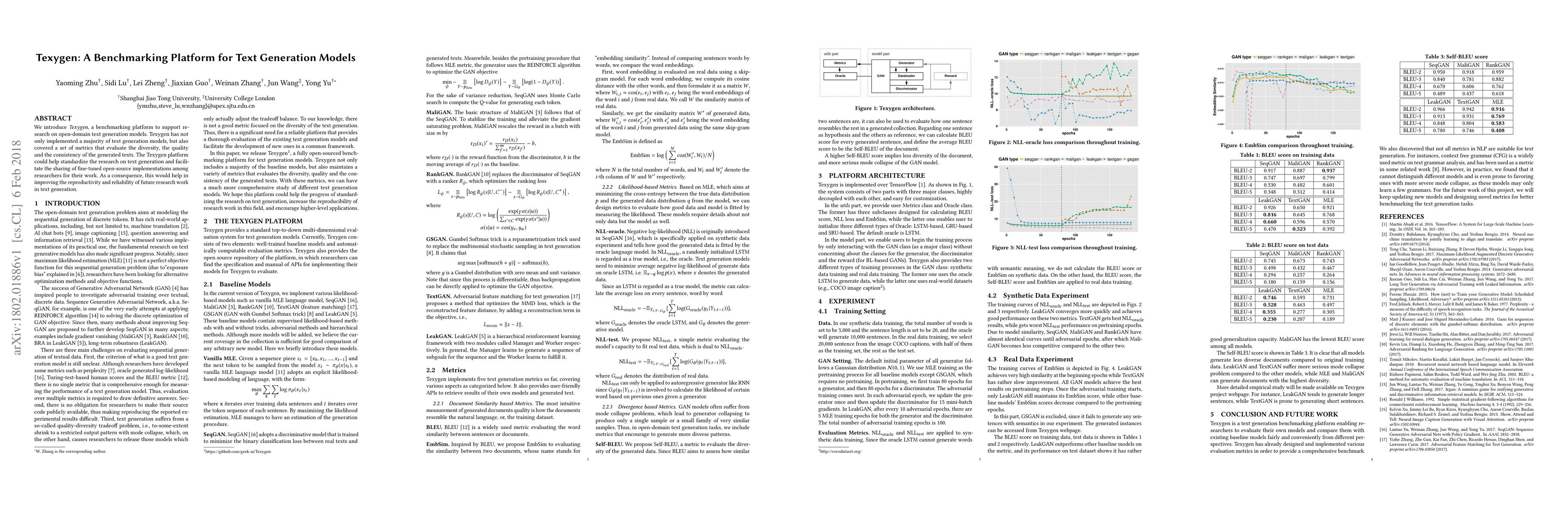 Texygen is a benchmarking platform designed to support research on open-domain text generation models, featuring implementations of various models and a comprehensive set of metrics to evaluate text diversity, quality, and consistency. It aims to standardize research and enhance the reproducibility and reliability of future text generation studies.