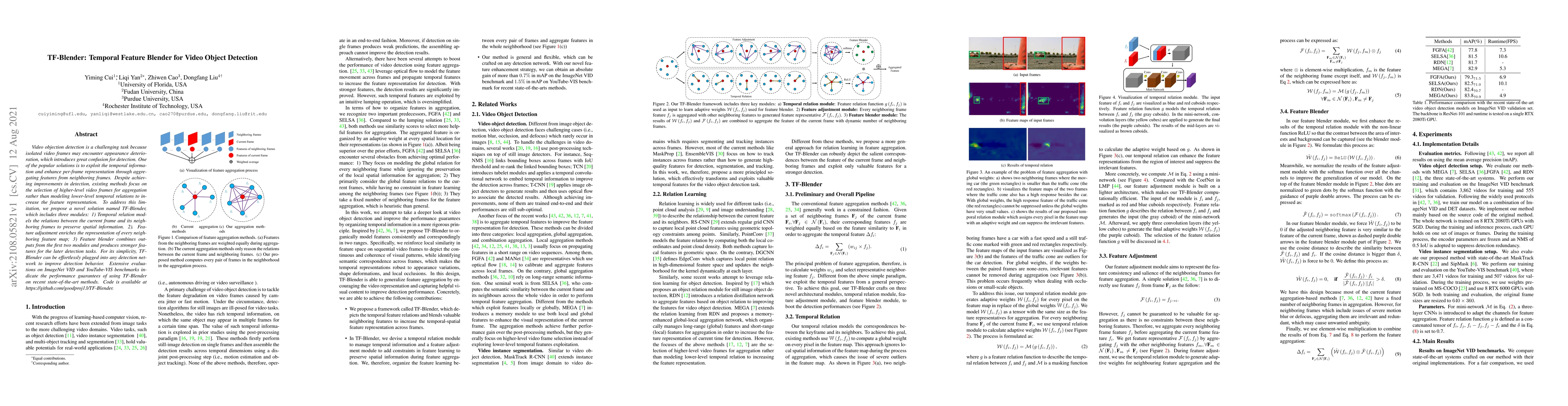 TF-Blender enhances video object detection by modeling temporal relations and enriching feature representations through neighboring frames, leading to improved detection performance on benchmarks like ImageNet VID and YouTube-VIS. It can be easily integrated into existing detection networks.