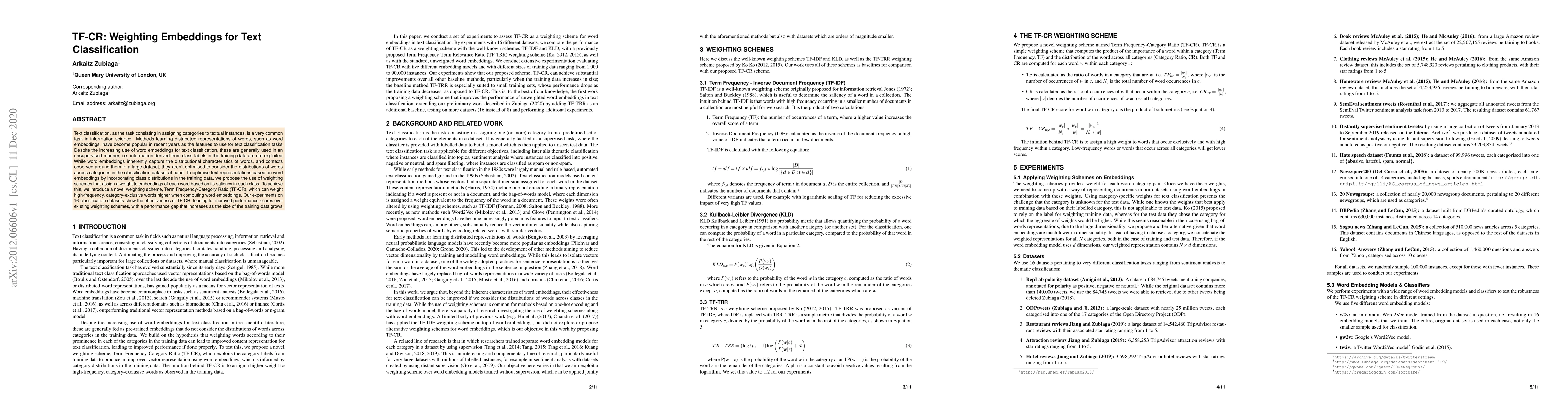 This paper proposes a novel weighting scheme called Term Frequency-Category Ratio (TF-CR) to optimize word embeddings for text classification by incorporating class distributions from training data, leading to improved performance, especially with larger datasets. Experiments on 16 datasets show that TF-CR outperforms existing weighting methods.