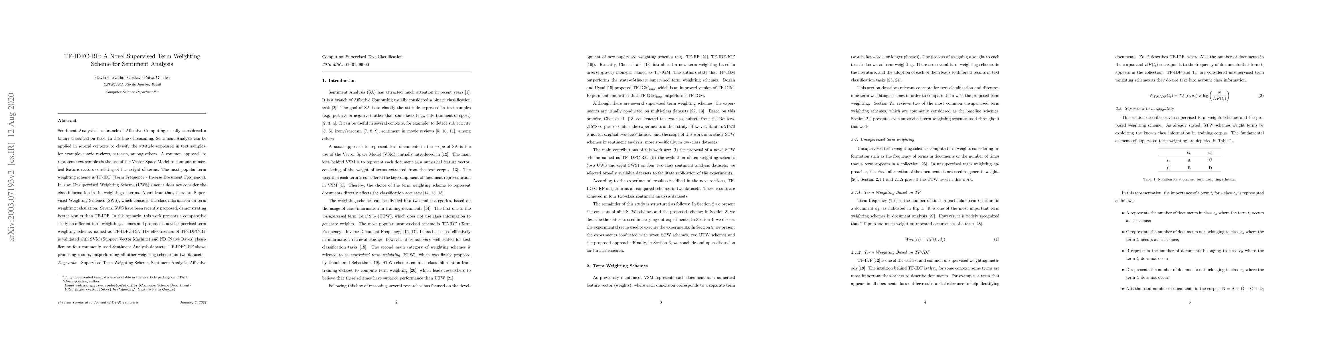 This paper proposes a novel supervised term weighting scheme, TF-IDFC-RF, for sentiment analysis. It compares TF-IDFC-RF with other schemes and finds it outperforms others on two of the four tested datasets when used with SVM and NB classifiers.