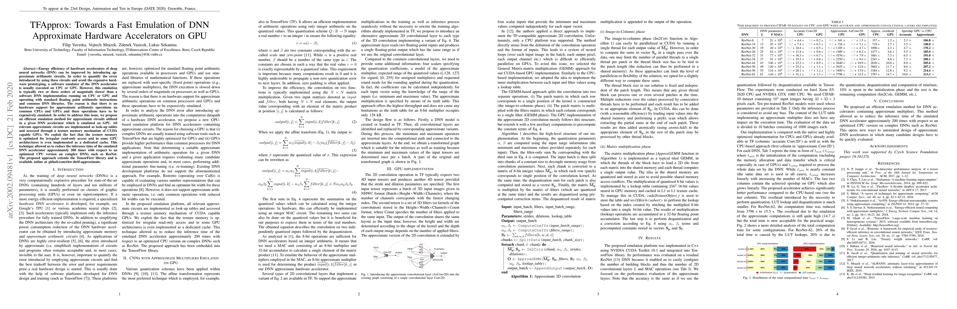 The paper proposes TFApprox, an efficient GPU-based emulator for DNN accelerators using approximate arithmetic to significantly reduce inference time by 200 times compared to CPU emulation, leveraging CUDA's texture memory for optimized access to look-up tables. The method extends TensorFlow and is available online for further exploration.