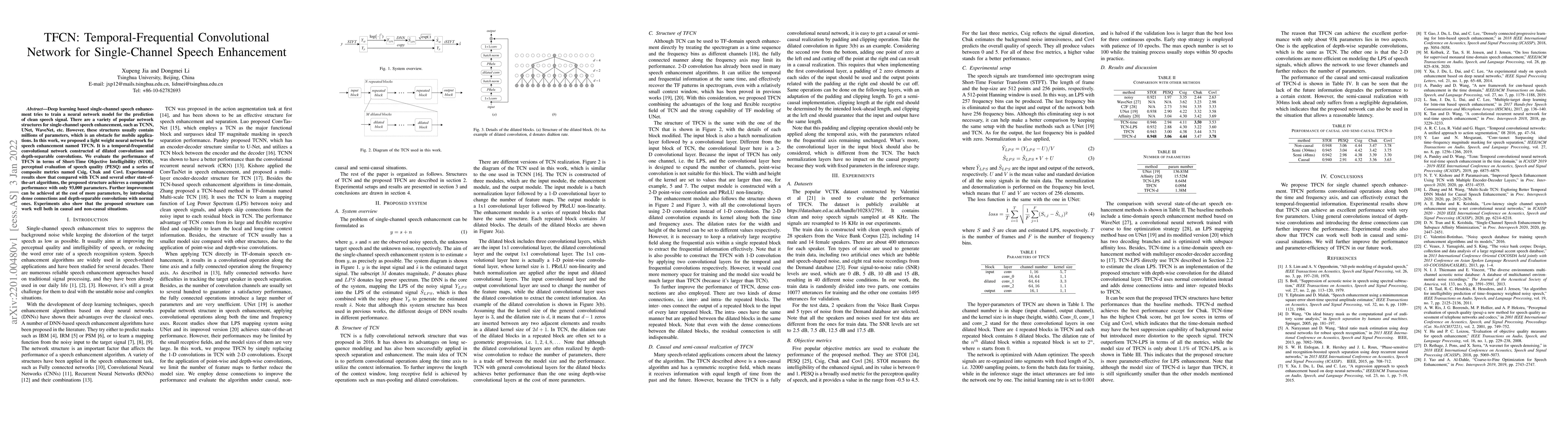 The paper proposes TFCN, a lightweight temporal-frequential convolutional network for single-channel speech enhancement, utilizing dilated and depth-separable convolutions to achieve comparable performance to other models with significantly fewer parameters. TFCN demonstrates effective performance in both causal and non-causal scenarios.