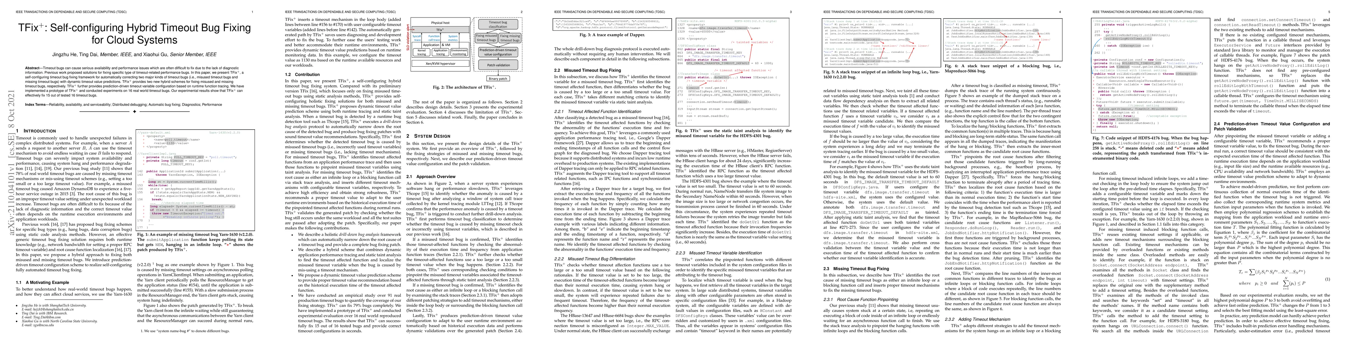 Timeout bugs can cause serious availability and performance issues which are often difficult to fix due to the lack of diagnostic information. Previous work proposed solutions for fixing specific type of timeout-related performance bugs. In this paper, we present TFix+, a self-configuring timeout bug fixing framework for automatically correcting two major kinds of timeout bugs (i.e., misused timeout bugs and missing timeout bugs) with dynamic timeout value predictions. TFix+ provides two new hybrid schemes for fixing misused and missing timeout bugs, respectively. TFix+ further provides prediction-driven timeout variable configuration based on runtime function tracing. We have implemented a prototype of TFix+ and conducted experiments on 16 real world timeout bugs. Our experimental results show that TFix+ can effectively fix 15 out of tested 16 timeout bugs.