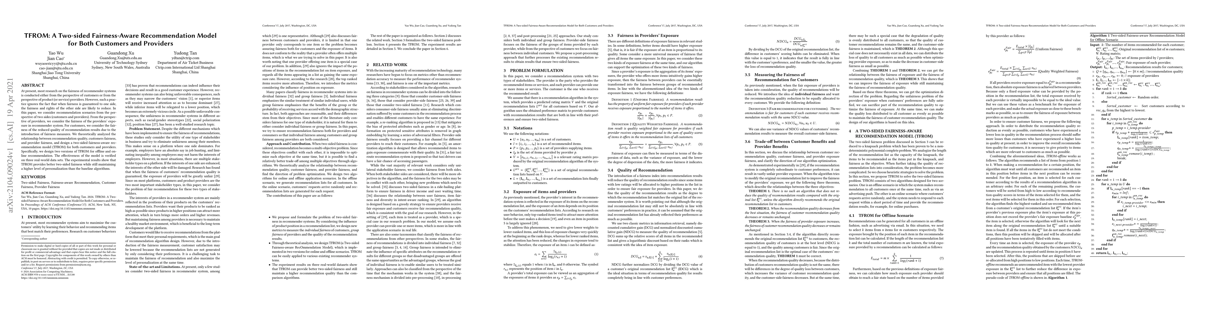 This paper introduces TFROM, a two-sided fairness-aware recommendation model that balances the interests of both customers and providers in recommender systems. The model maintains personalization while ensuring fairness for both parties, validated through experiments on real-world datasets.