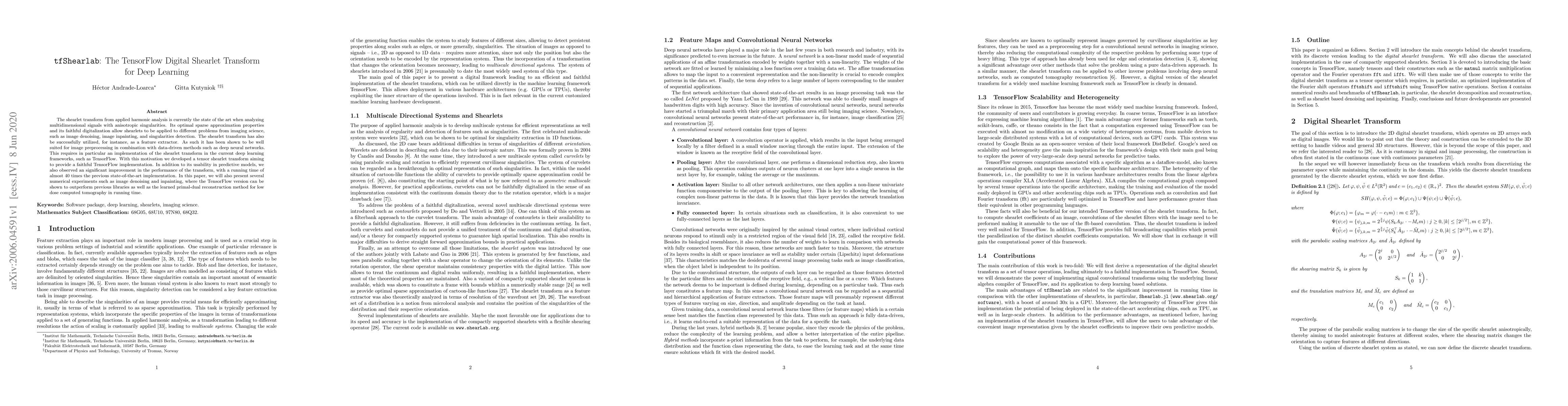 The paper introduces tfShearlab, a TensorFlow implementation of the shearlet transform, which significantly improves performance and running time. The transform is shown to outperform previous methods in tasks like image denoising and inpainting.
