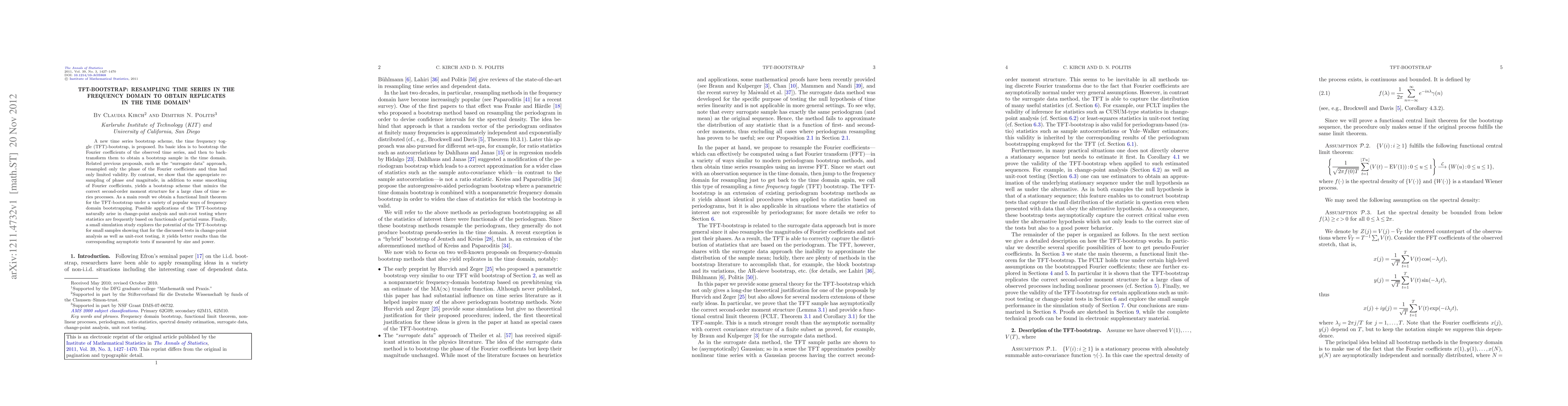 The TFT-bootstrap method resamples Fourier coefficients of time series to generate replicates in the time domain, offering a more valid approach than previous phase-only resampling methods. It achieves a functional limit theorem and shows better performance in small sample simulations for change-point analysis and unit-root testing.