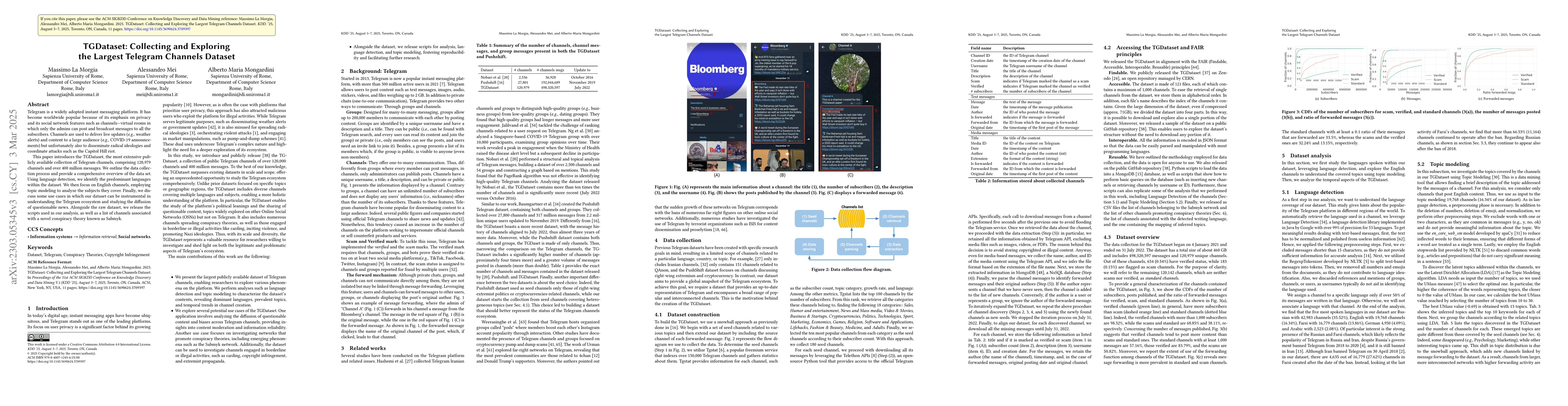The TGDataset comprises 120,979 Telegram channels and over 400 million messages, offering insights into the Telegram ecosystem and the dissemination of both legitimate and radical content. The dataset facilitates studies on language use, topics, and the spread of misinformation, including a specific focus on the Sabmyk conspiracy theory.