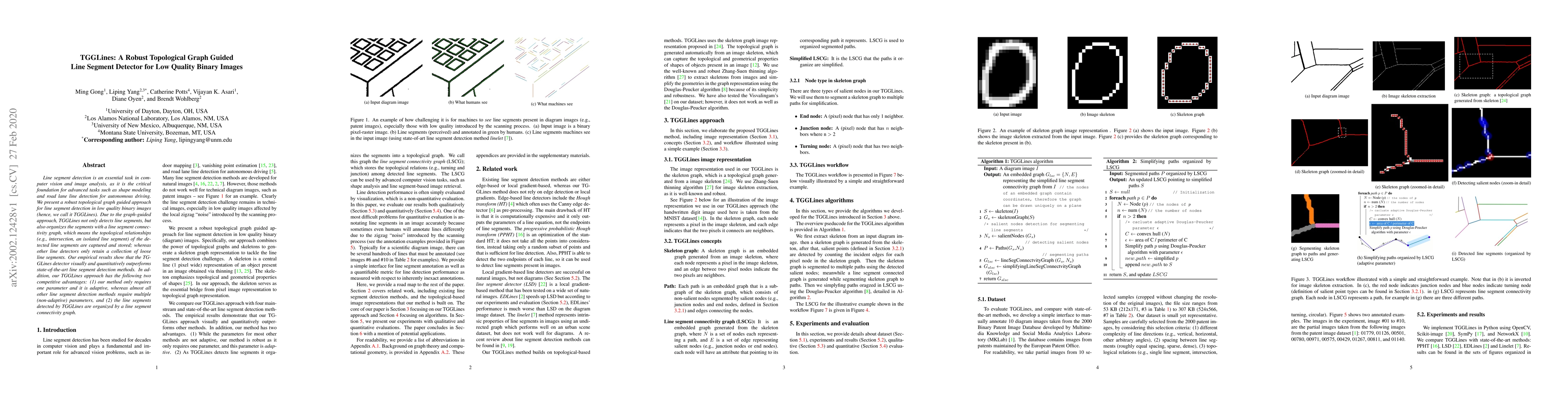 TGGLines is a robust topological graph guided line segment detector for low quality binary images, outperforming state-of-the-art methods. It uniquely organizes detected segments into a connectivity graph, capturing topological relationships, while requiring only one adaptive parameter.