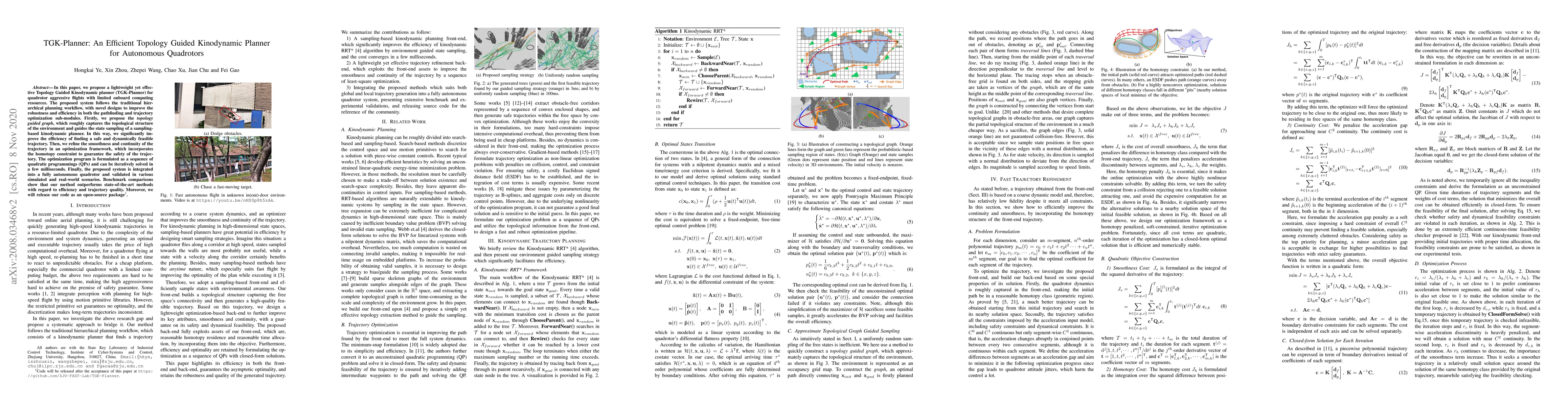 The paper introduces TGK-Planner, a lightweight kinodynamic planner for autonomous quadrotors, which uses a topology guided graph to enhance pathfinding efficiency and employs an iterative quadratic programming optimization for smooth trajectory refinement. Benchmarks show superior performance compared to existing methods.