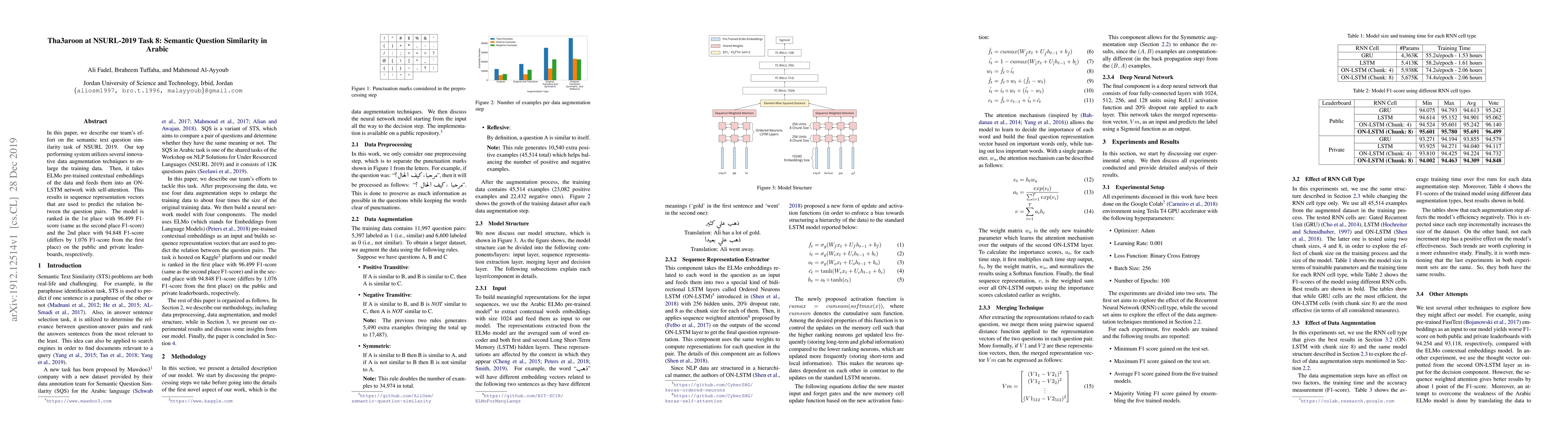 Summary: The Tha3aroon team achieved top ranks in the NSURL 2019 Task 8 by employing innovative data augmentation and ELMo embeddings fed into an ON-LSTM network with self-attention for semantic question similarity, achieving an impressive 96.499 F1-score on the public leaderboard and 94.848 F1-score on the private leaderboard.