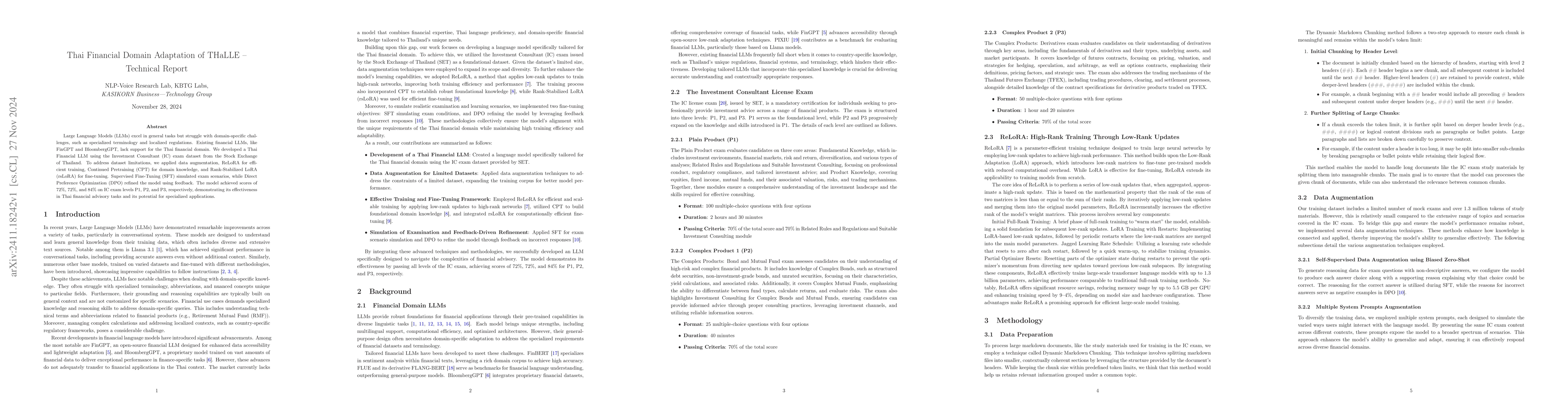 This paper presents a Thai Financial LLM adapted for domain-specific tasks, addressing limitations in existing financial LLMs by incorporating specialized Thai financial data and utilizing techniques like data augmentation, ReLoRA, and Continued Pretraining. The model achieved notable scores on Investment Consultant exam levels, showcasing its efficacy in Thai financial advisory contexts.