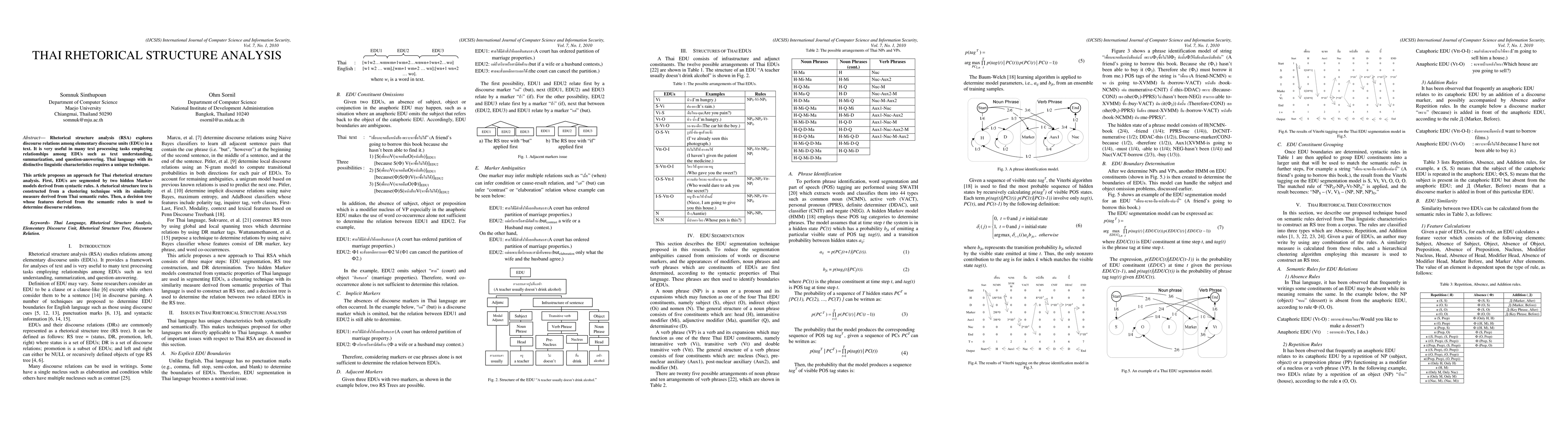 Rhetorical structure analysis (RSA) explores discourse relations among elementary discourse units (EDUs) in a text. It is very useful in many text processing tasks employing relationships among EDUs such as text understanding, summarization, and question-answering. Thai language with its distinctive linguistic characteristics requires a unique technique. This article proposes an approach for Thai rhetorical structure analysis. First, EDUs are segmented by two hidden Markov models derived from syntactic rules. A rhetorical structure tree is constructed from a clustering technique with its similarity measure derived from Thai semantic rules. Then, a decision tree whose features derived from the semantic rules is used to determine discourse relations.