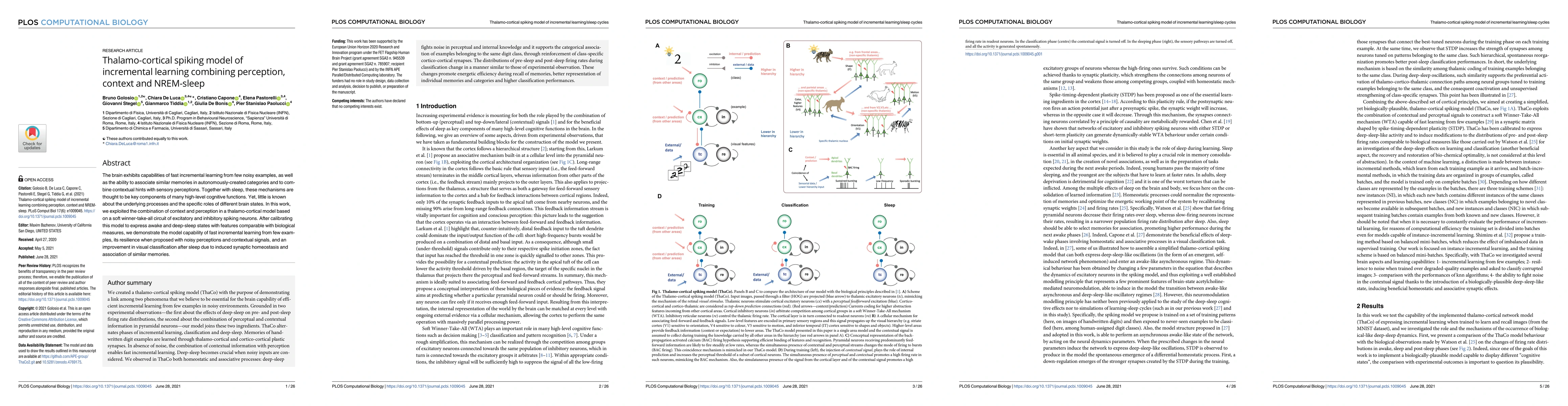 This research develops a thalamo-cortical spiking model that demonstrates fast incremental learning from noisy inputs, combining perception and context. The model shows improved visual classification post-sleep, highlighting the role of sleep-mediated synaptic homeostasis and memory association in learning resilience.