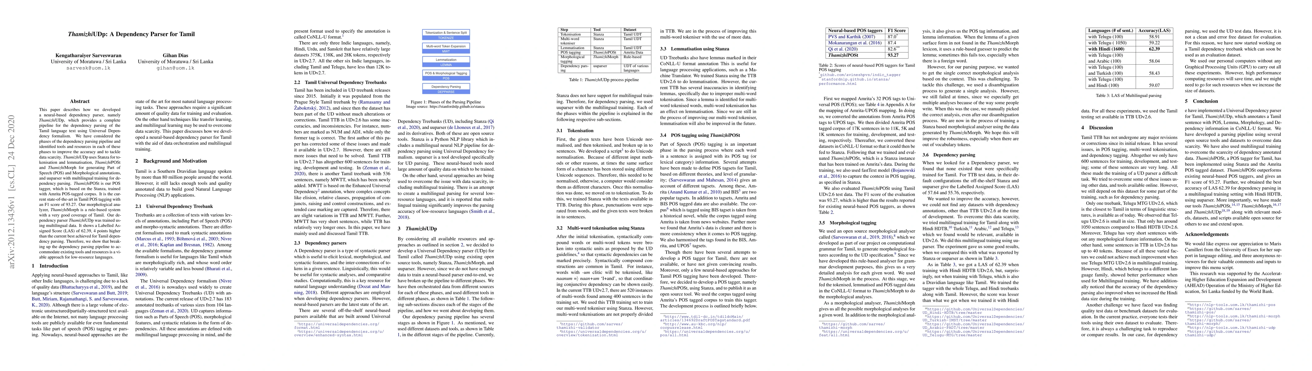 This paper describes how we developed a neural-based dependency parser, namely ThamizhiUDp, which provides a complete pipeline for the dependency parsing of the Tamil language text using Universal Dependency formalism. We have considered the phases of the dependency parsing pipeline and identified tools and resources in each of these phases to improve the accuracy and to tackle data scarcity. ThamizhiUDp uses Stanza for tokenisation and lemmatisation, ThamizhiPOSt and ThamizhiMorph for generating Part of Speech (POS) and Morphological annotations, and uuparser with multilingual training for dependency parsing. ThamizhiPOSt is our POS tagger, which is based on the Stanza, trained with Amrita POS-tagged corpus. It is the current state-of-the-art in Tamil POS tagging with an F1 score of 93.27. Our morphological analyzer, ThamizhiMorph is a rule-based system with a very good coverage of Tamil. Our dependency parser ThamizhiUDp was trained using multilingual data. It shows a Labelled Assigned Score (LAS) of 62.39, 4 points higher than the current best achieved for Tamil dependency parsing. Therefore, we show that breaking up the dependency parsing pipeline to accommodate existing tools and resources is a viable approach for low-resource languages.